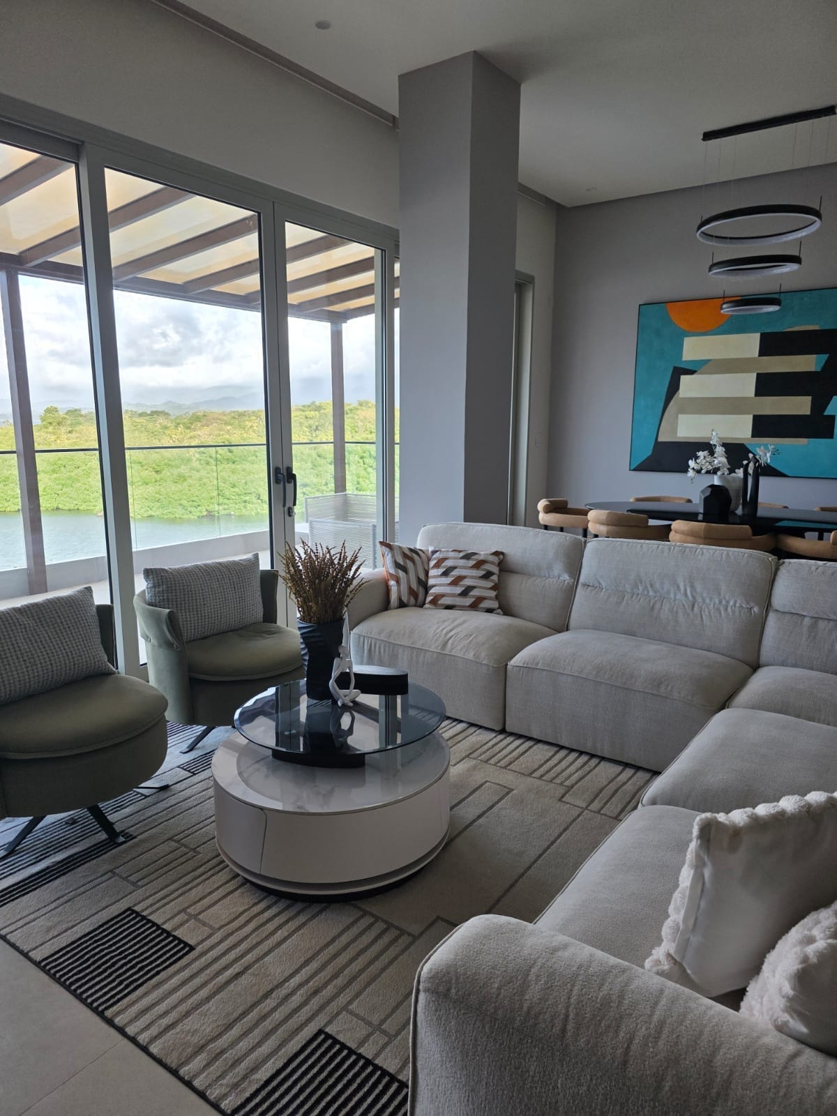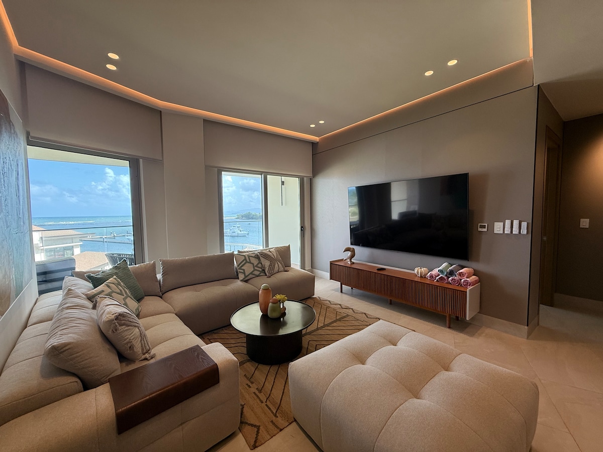 エスコンディダパナマ •モダンな3BR/3BAコンドミニアム305Aマリーナビレッジ、オーシャンビューとマリーナビュー、ダイニングパティオ • 設備の整ったキッチンと、大型スマートテレビとLED照明が備わったエレガントなリビングルーム • 寝室1:キングサイズベッド、55インチテレビ、専用バスルーム、カスタムヘッドボード、温かみのある木製仕上げ • 寝室2:クイーンベッド、スマートテレビ、マンダラの壁、柔らかいニュートラルカラー • 寝室3:4つのツインベッド、仕事用デスク、テレビ、緑の景色が楽しめる子供部屋 • 贅沢な現代的デザイン、内蔵家具、遮光シェード、竹綿のデラックスシーツ