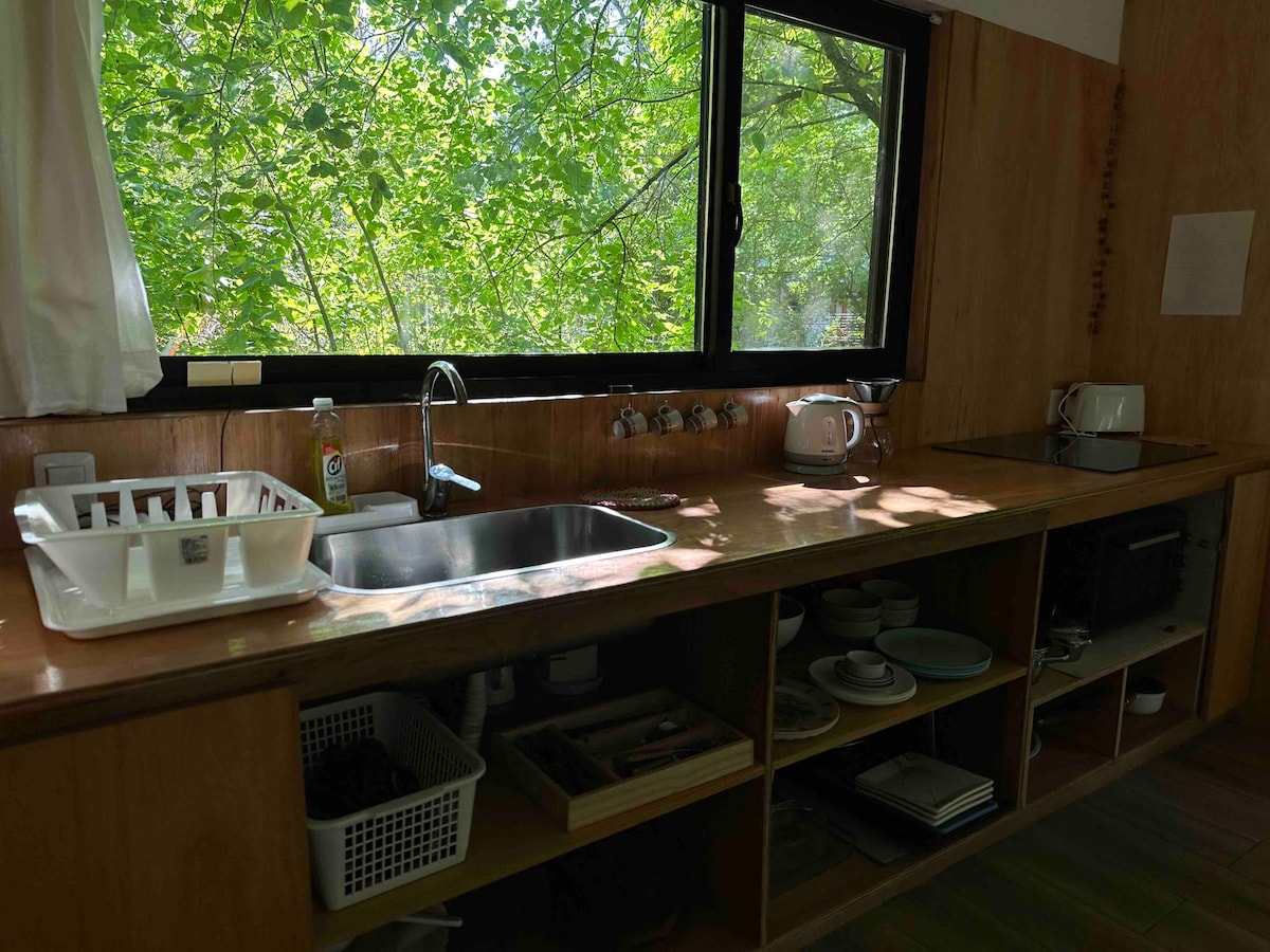 Casitas_del_ensueno: Cabaña a 50m. de la playa en medio de bosque nativo. Construida con materiales cálidos y de diseño, aberturas doble vidrio, estufa a leña, AC frio/calor, calefactores en los cuartos. Amplio espacio abierto living-cocina con todo para 4 huéspedes (max. 3 adultos), 1 dormitorio en suite con salida al deck, 2do dormitorio con cama nido (twin) y 2do baño. Wifi por FibraOptica. Pura luz y bosque a un paso del río. Estacionamiento 2 autos, parrillero, TV, hamaca, sillas de playa.