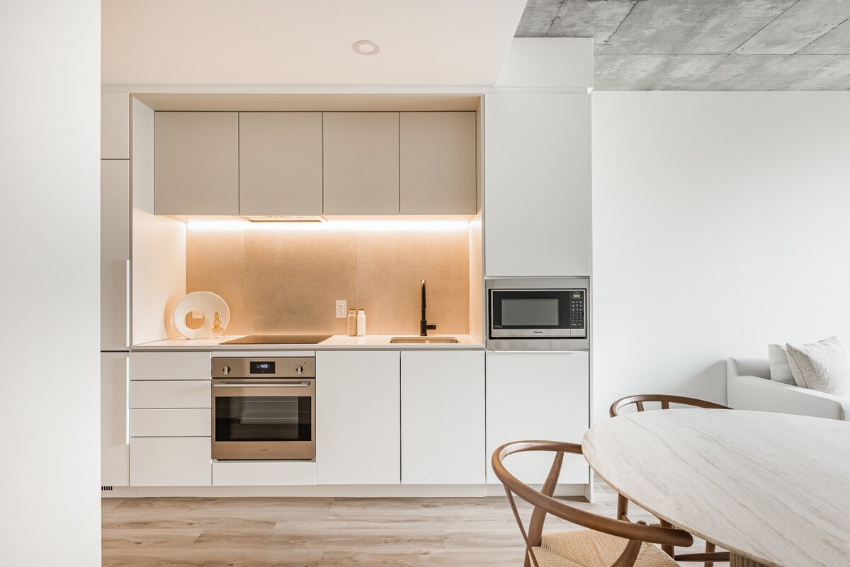モントリオールの街を一望できる明るくモダンなアパートで、息をのむような夕日を眺めることができます。自然にインスパイアされたインテリアは落ち着きのあるオリーブトーンを基調としており、温かみのあるリラックスした雰囲気を演出します。サント・カトリーヌ通りに位置し、アトワーター地下鉄駅とギー・コンコルディア地下鉄駅からわずか数歩の場所にあり、おしゃれなカフェ、レストラン、ショップ、アレクシス・ニホンモールに囲まれています。モントリオールの活気を感じながら、自宅のようにくつろぐのに最適な場所です。