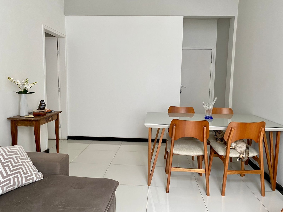 ゲストの方々を考えて、アパートは完全に改装されました。 60年代にインスパイアされたシンプルで親密な装飾。とても風通しの良い快適な場所で、朝日が降り注ぎ、ヴィラ・ヴェーリャで最もグルメなレストランが集中しているデリシアス通りの中心部にあります。 アパートは、州で最も美しいビーチ、コスタビーチの遊歩道から数ブロックの場所にあります。 ここで忘れられない思い出を作りましょう。