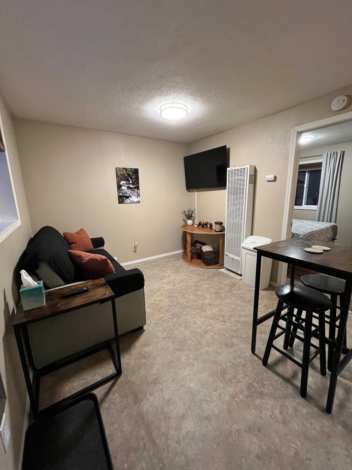 ケナイのダウンタウンからわずか5分、ビーチから5分、(URL非表示)から15分の5エーカーの静かな場所にあるガレージ上の1ベッドルームアパートです。このユニットには新しいクイーンベッド、DirecTv、フルバスルーム、専用玄関があり、食器、鍋、フライパン、銀器などが完備されています。 到着時に建物が少し傾いていることに気づくかもしれません。 エンジニアによると、建物は完全に安全ですので、ご心配なく。