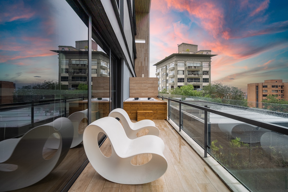 建物のテラスに素晴らしいプールエリアがあります ジャグジー、スチーム、ジム 専用バルコニー、ジャグジー、クイーンサイズベッド、エアコン 独立した寝室とリビングルーム ロビーにレストラン/バーラウンジ。 ルームサービス 現代的なデザインで快適で広々としています。 設備の整ったキッチン 街と山の素晴らしい景色。 市内の最高のバー/レストラン、Provenzaに近いです。 アパート内に洗濯機とガス乾燥機があります。 メデジンの象徴的なエネルギーリビングビル 11階のバルコニーに専用ジャグジー 1,000平方フィート 高速Wi-Fi 24時間365日チェックイン