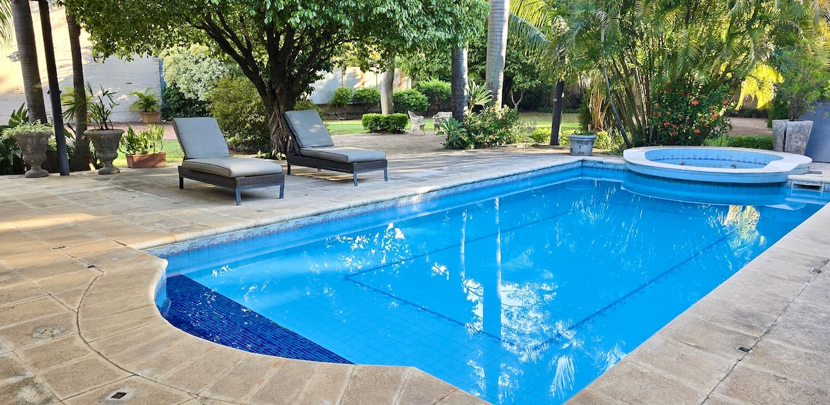 Residencia con ubicación estratégica: Diagonal a Marketplace, Biggie24hs a 30 mts. con salida directa a Ciclovia de San Bernardino. A 5 cuadras del lago, a 9 cuadras del Club Náutico, a 3 cuadras de Superseis Express. Hermoso y amplio patio, full empastado con palmeras diversas y árboles. Gran piscina con jacuzzi y reposeras. Deck solarium y baño de piscina. Amplio Quincho con parrilla climatizado y sala de estar. Estacionamiento para 4 autos grandes o 6 autos chicos.