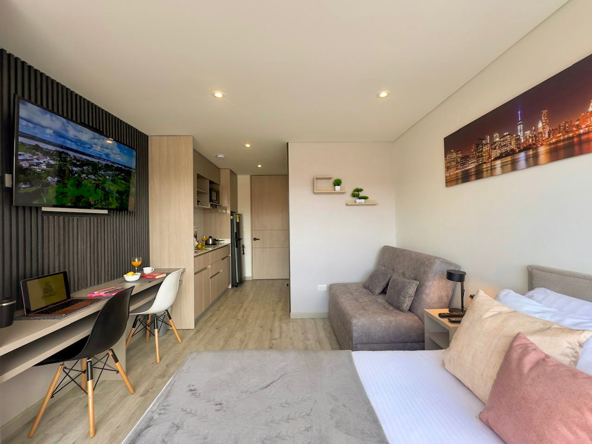 Stunning loft with breathtaking city & mountain views. Indulge in the most luxurious bed in the building, providing a level of comfort akin to a five-star hotel. Plush pillows ensuring the best sleep of your life. Enjoy a 60" TV with Netflix, a well-equipped kitchen, and relax in the easy chair by the window. Hot water shower, Hairdryer, ample closet space, and a perfect work area. Upcoming amenities: rooftop, coworking, gym. Close to Transmilenio station. Book now for an unforgettable stay