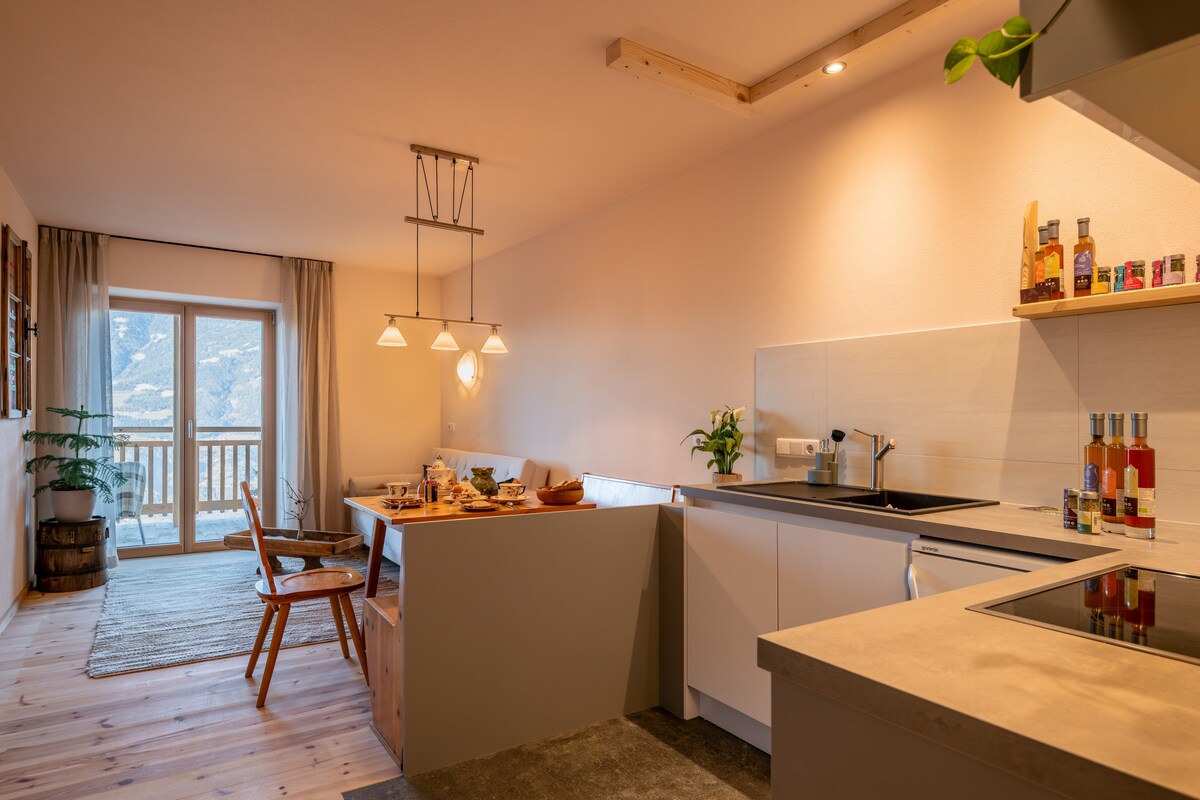 私たちは、ブリクセンからそう遠くない、カルノルという小さな村で果物と野菜を栽培するオーガニック農場を運営しています。2020年冬以来、完全装備のアパートメントを貸し出しています。建物は古典的な木と石の建築で、クライマハウスA認定を受け、最新の基準で設備されています。私たちは、独自のキッチン、バスルーム、バルコニーを備えた美しいアパートを提供しています。無料駐車場とWi-Fi、ブリクセンカードが含まれています