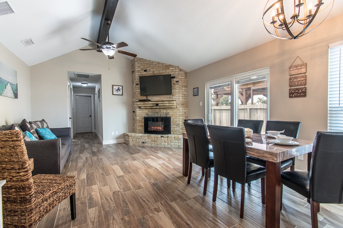 Very clean comfortable 3/2 private home on a waterfront canal by Laguna Madre Bay. We follow the Airbnb’s 5-step enhanced cleaning process. We have Security Camera's and home Alarm system. Back yard is a hit with everyone, very relaxing. You can fish off the dock in the back yard or take the kayaks. Mustang Island beach is near by. We provide life jackets for the kayaks but we are not responsible for accidents. NO bottom fishing!! Bring your own poles, hooks, bobbers & bait. Pet Fee $40 per pet