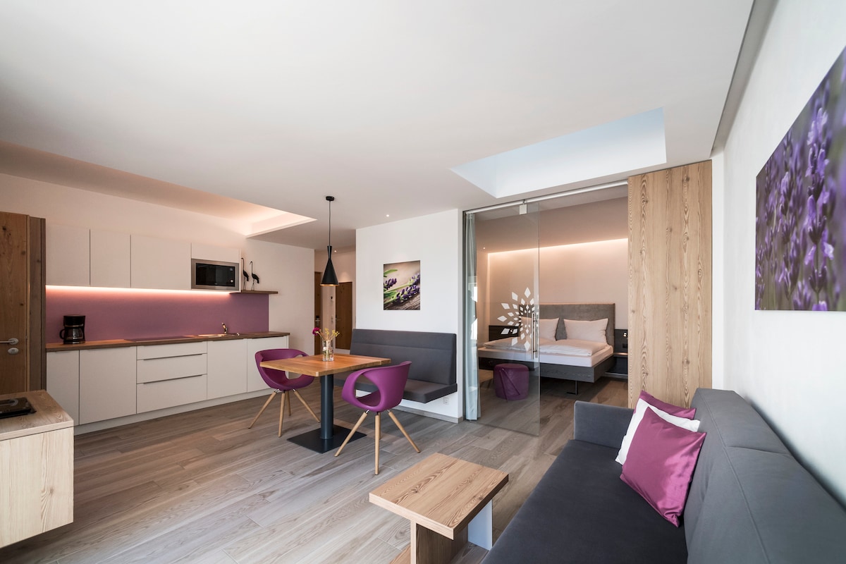 山々や渓谷からドロミテ山脈を望む、独立した寝室を備えたアパートメント。 バルコニーまたはテラスからは、山々または渓谷からドロミテ山脈までの景色を眺めることができます/リビングルーム/HD LEDテレビ/設備の整ったブランドキッチン/キングサイズベッド付きの寝室1部屋/シャワー、トイレ、ビデ付きのバスルーム/高速Wi-Fi/32〜38 m²/1〜2名様。 スパ:スチームバス、フィンランド式サウナ、バイオサウナ、冷水プール、リラクゼーションエリア、XXLインフィニティジャグジー、プール。クロスフィットボックス – ジム。