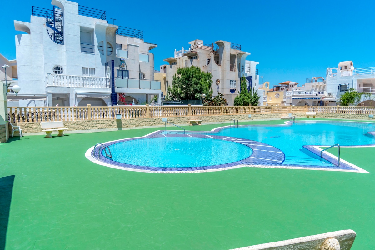 プール付きのプライベートな住宅地の1階にある住宅で、ビーチから徒歩5分のところにある、Dunas de la Mata自然公園の隣にあります。 一年中太陽、プール、ビーチをお楽しみください。 2つの寝室(ダブルベッド1台とシングルベッド2台)とソファーベッド、1つのバスルーム、設備の整ったキッチンで構成されています。 屋根付きテラスと屋根なしテラス。