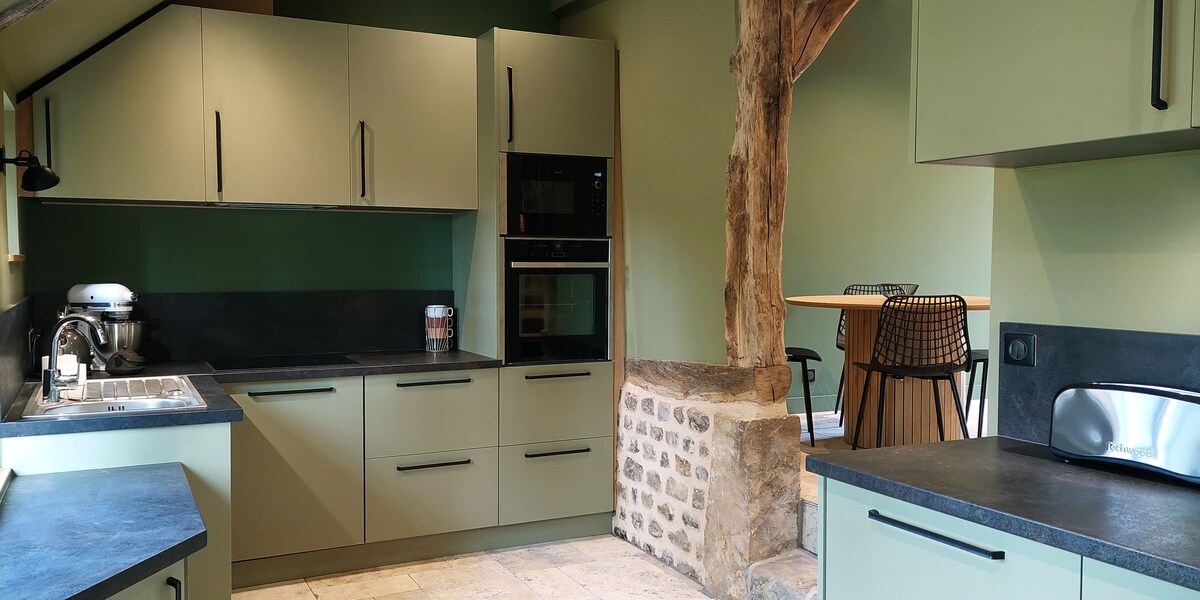 La Lanterneは、ノルマンディーのトゥルヌドスールセーヌ(ル・ヴォルドルイユ/ヴァル・ド・ルイユから4 kmの静かな村)のセーヌ川のほとりにある大きな家の美しい敷地内にある、明るくて光がたっぷり入るロフトタイプのコテージ(50㎡)です。 家は最近家具が揃えられ、設備が整っています。オープンプランキッチン、キングサイズのダブルベッドを備えた寝室、ソファ、デスクを備えた2つの広い部屋。ウォークインシャワー付きの専用バスルーム。豪華なインテリア。 平穏で魔法のような自然に近い環境です。