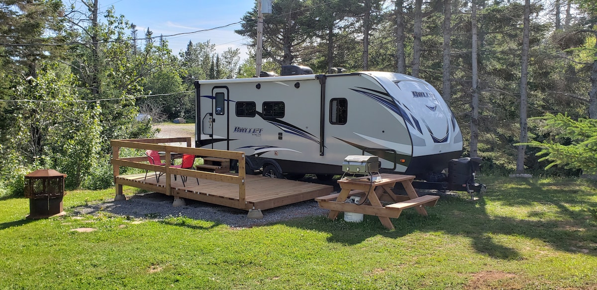 26フィートのトレーラー。キャンプ・デュ・カープ・ルージュの新しい非常に豪華なカテゴリーの中で最も収納力のあるとても美しいトレーラー、海のパノラマビュー(4時間の土地) カップルまたはお一人様のみ。 クイーンベッド、とても快適な長椅子、テーブル、32インチテレビ、冷蔵庫、コンロ、電子レンジ、バーベキュー、パティオセット、キューリグコーヒーメーカー(2カプセル入り)。 お客様のご滞在が最高のものになるよう、必要なすべての設備を完備しております!