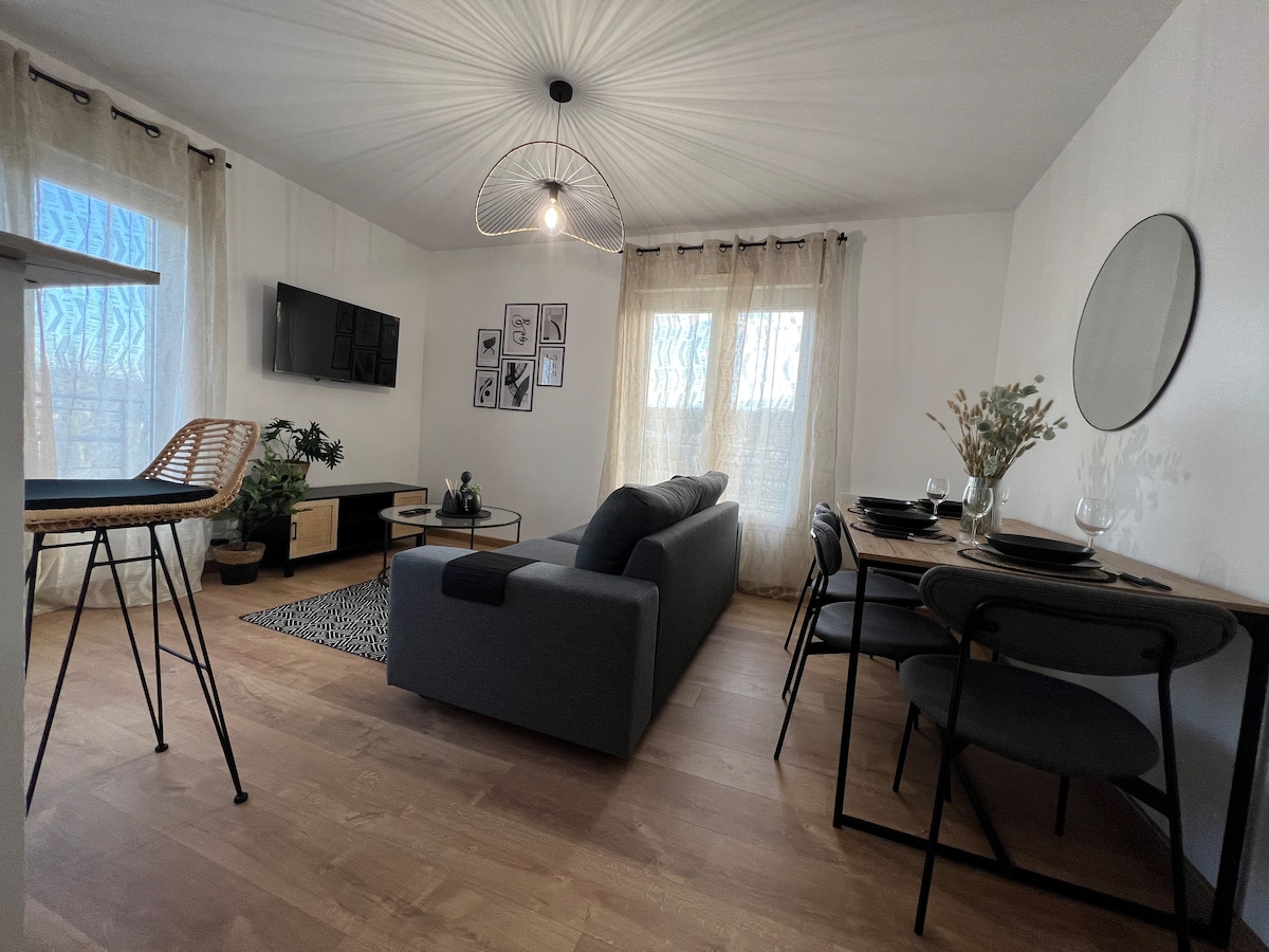 クーロミエの中心部に位置し、商店街に隣接する50m²の2部屋のアパート。クイーンサイズのベッドとスマートテレビを備えたベッドルーム、設備の整ったキッチン(オーブン、電子レンジ、食器洗い機、ネスプレッソなど)、高速ファイバーを備えたオフィススペース、大きなシャワーと洗濯機を備えたモダンなバスルーム、そして独立したトイレがあります。おしゃれなインテリアで、カップル、家族、ビジネスマンに最適な快適さをお約束します。