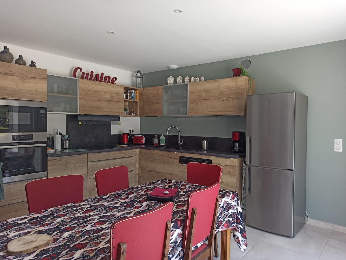 A louer, maison de 60 m², avec cour fermée et parking extérieur, face au gîte. 1 pièce de vie au rez de chaussée avec cuisine, salon, cheminée. 1 salle d'eau au rez de chaussée A l'étage, 2 chambres en enfilade, une première chambre parentale avec un lit double 160x200. Au fond, une chambre d'enfants avec deux lits simples 120x190 et 90x190. C'est une maison qui allie le confort des équipements modernes et le charme des vieilles pierres . Chauffage poêle à bois et radiateur électrique.