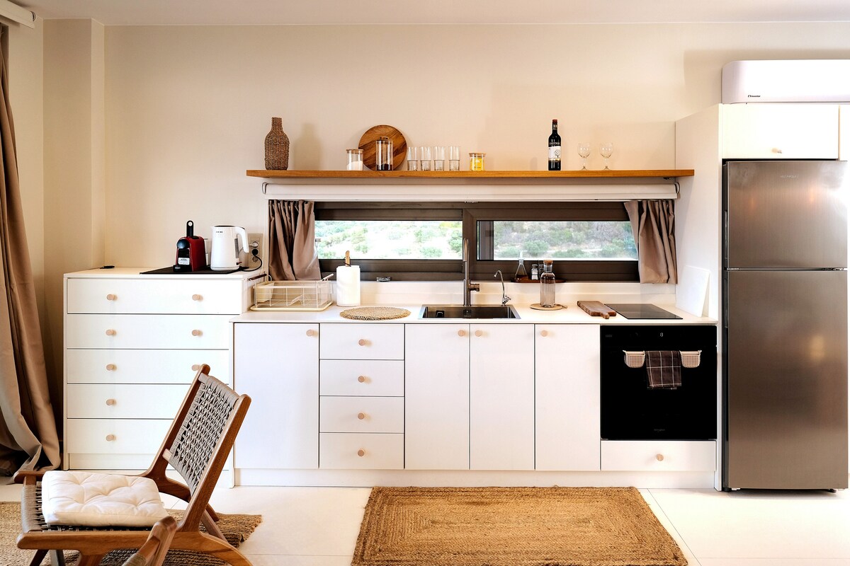 Madalin Guest House – A Boho Retreat Above the Cretan Sea Perched on a tranquil mountainside Madalin Guest House offers a serene escape surrounded by raw natural beauty and panoramic sea views. Step out onto your private terrace and take in a sweeping landscape of olive groves, Mediterranean forest, dramatic cliffs, and the deep blue expanse of the Cretan Sea. Whether you're here to relax, explore, or simply breathe, Madalin is your haven in eastern Crete.