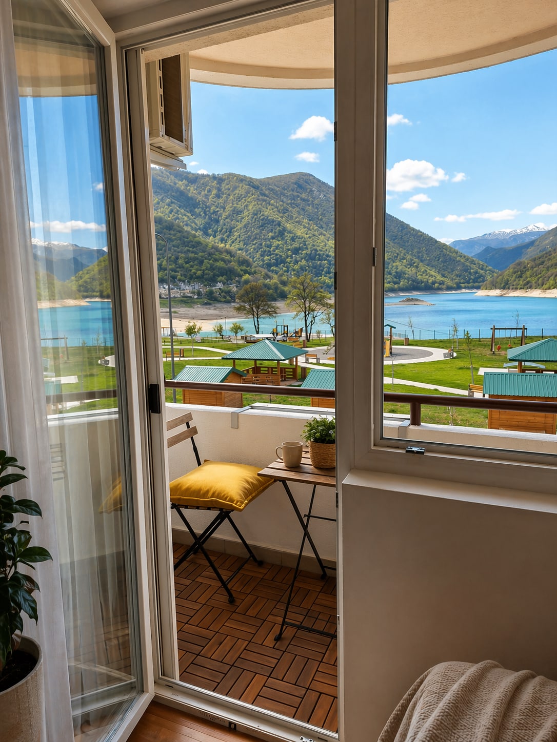 手つかずの自然に囲まれたこの魅力的でスタイリッシュに装飾されたコテージからは、ドゥルミトル山とリブリエ湖の素晴らしい景色が見えます。 正面は全面ガラス張りで、忘れられないパノラマ体験を提供します。 見事な照明が、その素晴らしい外観を引き立てています。 2階のギャラリーには、快適なフレンチベッドが備えられており、目覚めると、息をのむような山の景色が見える完璧な位置にあります。 このコテージは、自然の美しさと静けさを完全に楽しむための理想的な隠れ家です。