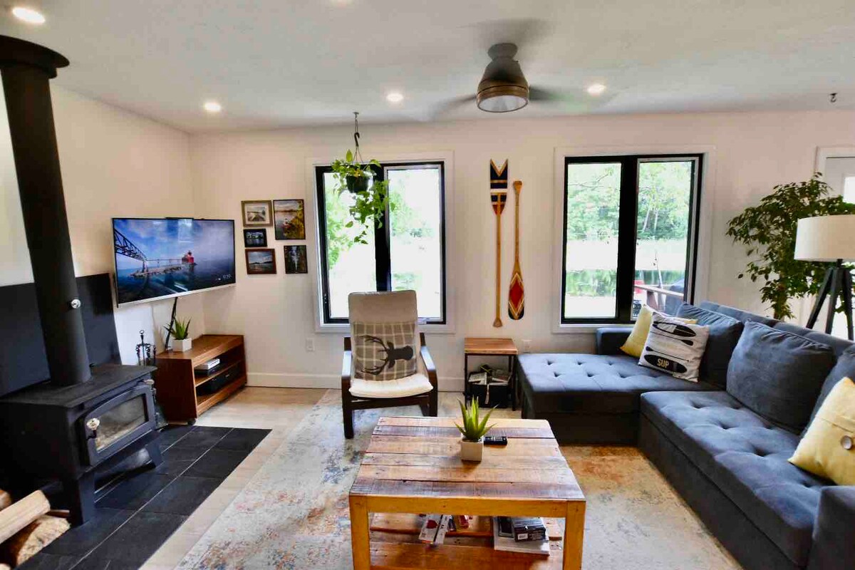 ノースリバーのそばにある魅力的なゲストハウスキャビンにご宿泊ください。 カヌーやカヤックを出すことができるプライベートリバーフロント 道の向かい側に公共ボート発着所があります。 いくつかの湖、トレント・セヴェルン、複数の公園、広大なオフロード&スノーモービルトレイルまで車ですぐ。 メインフロアには、キングサイズに簡単に組み合わせることができるツインベッド2台と、快適なクイーンサイズのソファベッドが備わったシングルロフト。 薪ストーブが主な暖房です。 ペットとその責任ある飼い主は大歓迎です!