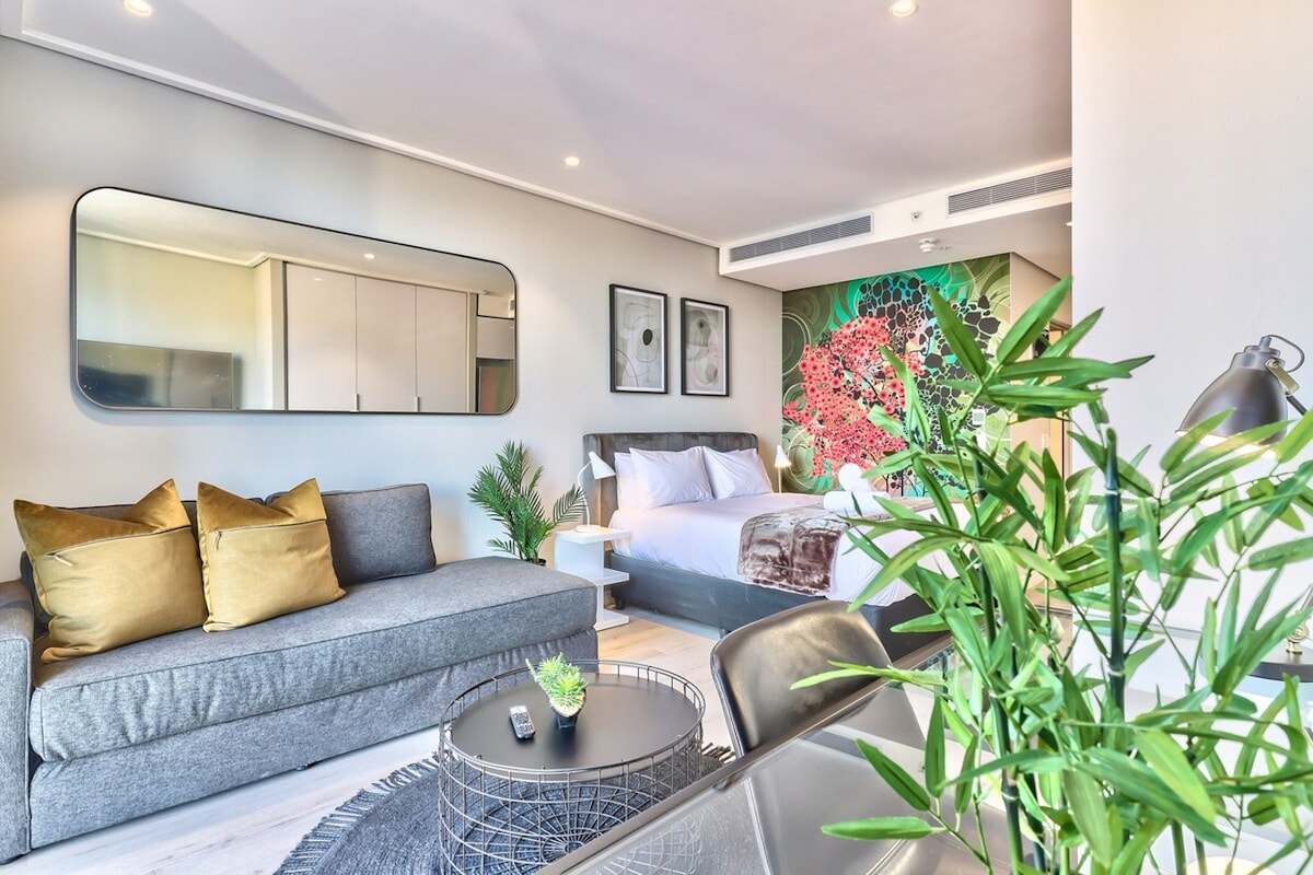 山の景色とバルコニーを備えたトレンディなケープタウンのワンルームマンション
