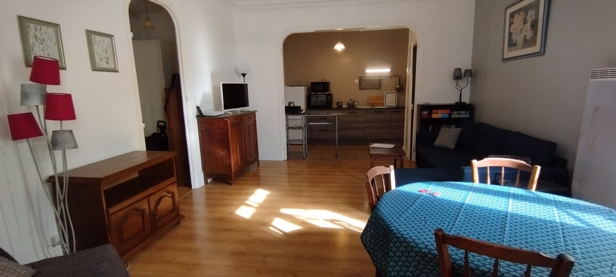 "Appartement en résidence, lumineux et calme, situé à 2 pas des thermes. 1 très grande chambre dotée de 1 lit double et 1 lit simple. Salon-salle à manger avec canapé lit + 1 BZ. Cuisine équipée + petite buanderie et salle de bain. Parking gratuit dans la rue. Proche des parcs et du centre-ville et de ses nombreux commerces, à 10 minutes à pied d'un marché couvert très bien achalandé en produits régionaux. Pas d'accès PMR, désolée pour séjour de + de 15 jours ne pas hésiter à me contacter
