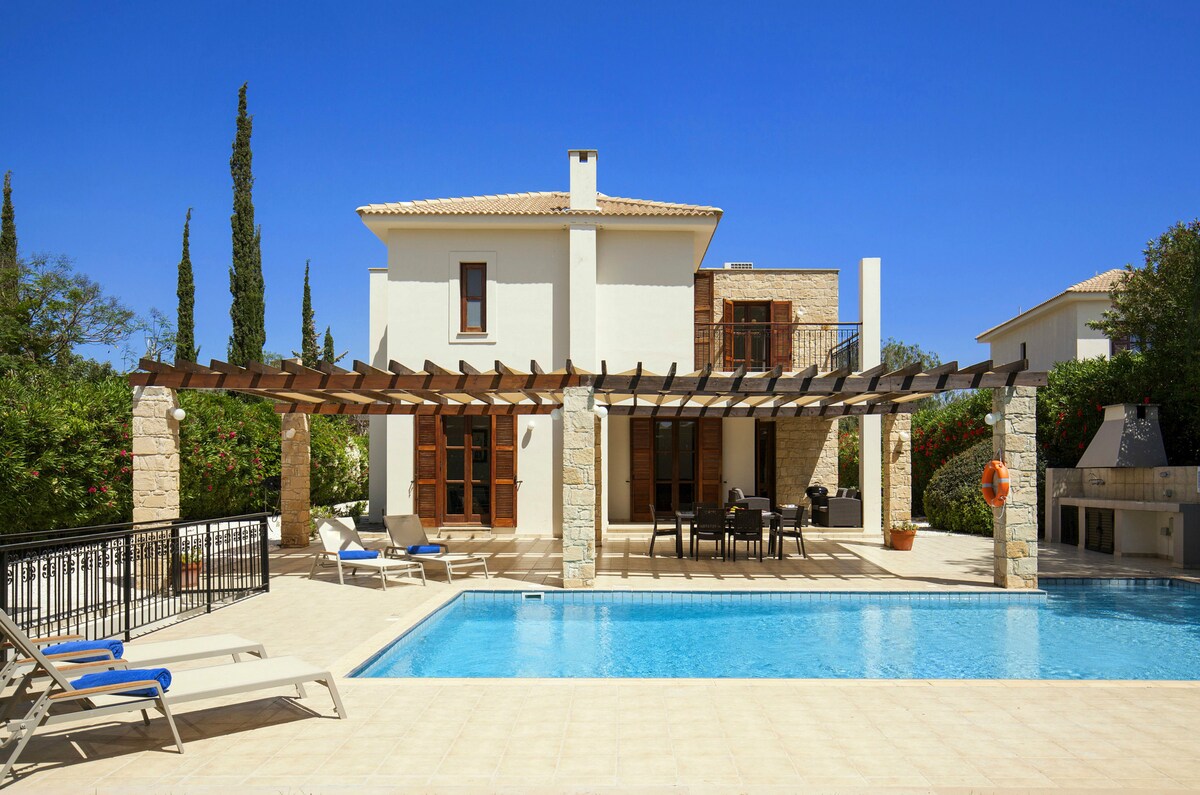 It is always lovely to stay in a new villa with everything bright and sparkling. This is one such villa! Located on the newly constructed Grand Poseidon complex of the prestigious Aphrodite Hills Resort, Villa Sphella offers luxurious, contemporary comfort and style to six guests together with access to the resort’s amazing amenities. The villa is beautifully finished with neutral decor, sumptuous furnishings, attractive wall art and the very best of kitchen and bathroom fittings.