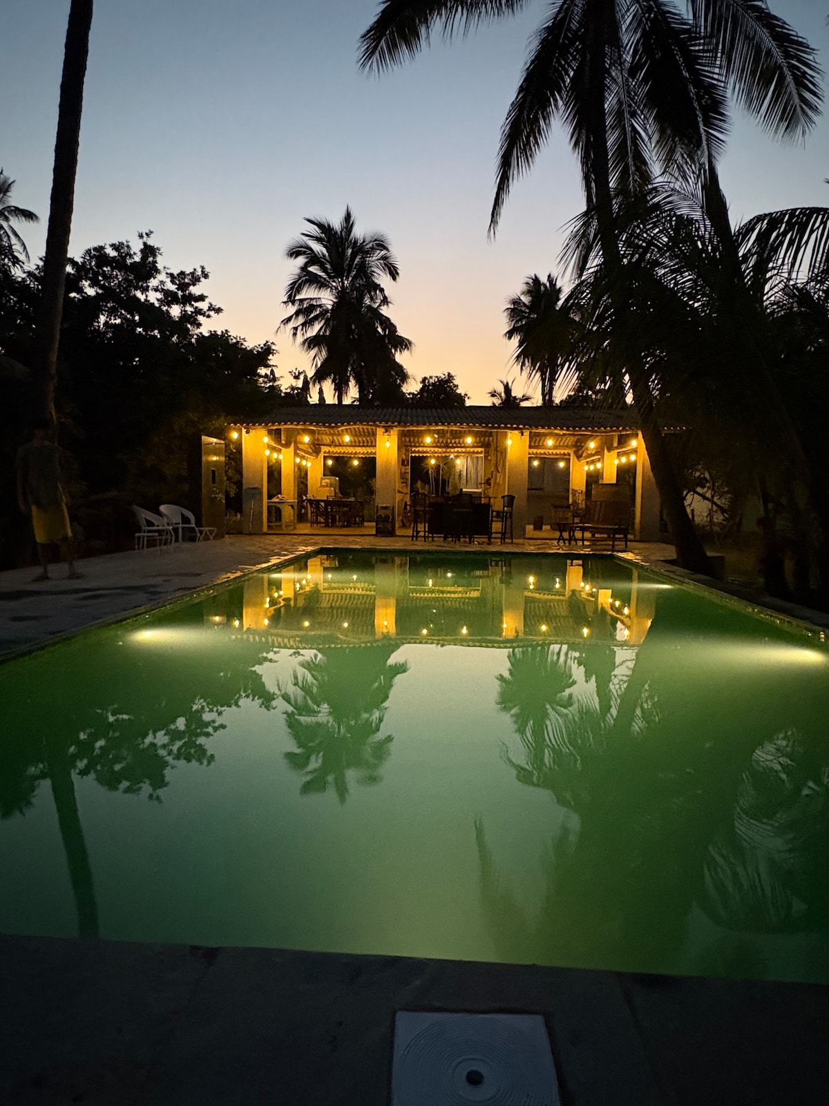 This 19th Century 4BHK PoolVilla, across the Bordi beach is a part of an 8 acre organic Chikoo orchard. The listed price is for ONE large 350 sq feet bedroom equipped with air-conditioning, two queen size antique beds and attached bathrooms. Guests have shared access to an airy veranda with antique swings overlooking the beach, a spacious living room, a separate dinning room, a fully equipped kitchen, a large backyard & a one acre children’s play area equipped with swings, slides & a jungle gym.