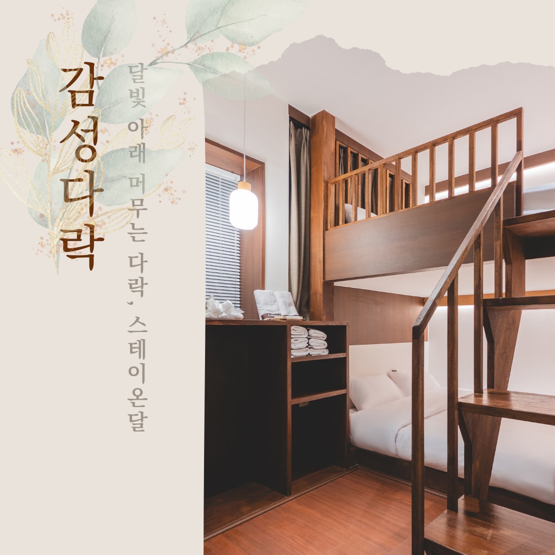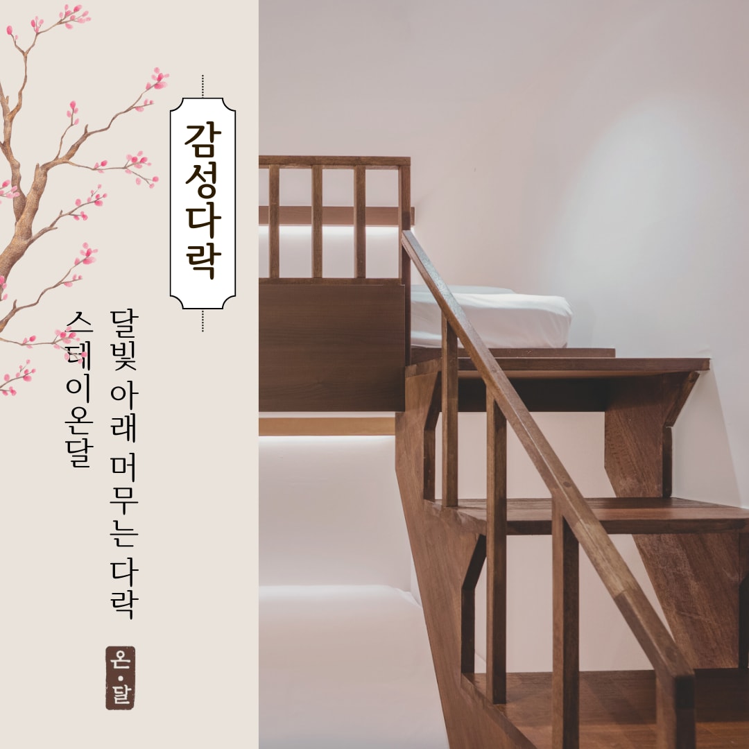 달빛의 은은함이 공간 속에 스며든 이곳은, 온전한 나를 마주하는 '달이 머무는 곳'입니다. 대전 원도심의 정취가 내려앉은 공간에서, 차분한 색감과 세심한 배려가 담긴 설계를 경험해 보세요. 낮에는 원도심의 낭만을 거닐고, 밤에는 고요한 사색의 시간을 가지며 비로소 채워지는 쉼의 여백을 제안합니다. 당신의 소중한 여행이 가장 편안한 안식처로 기억될 수 있도록 정성을 다하겠습니다.