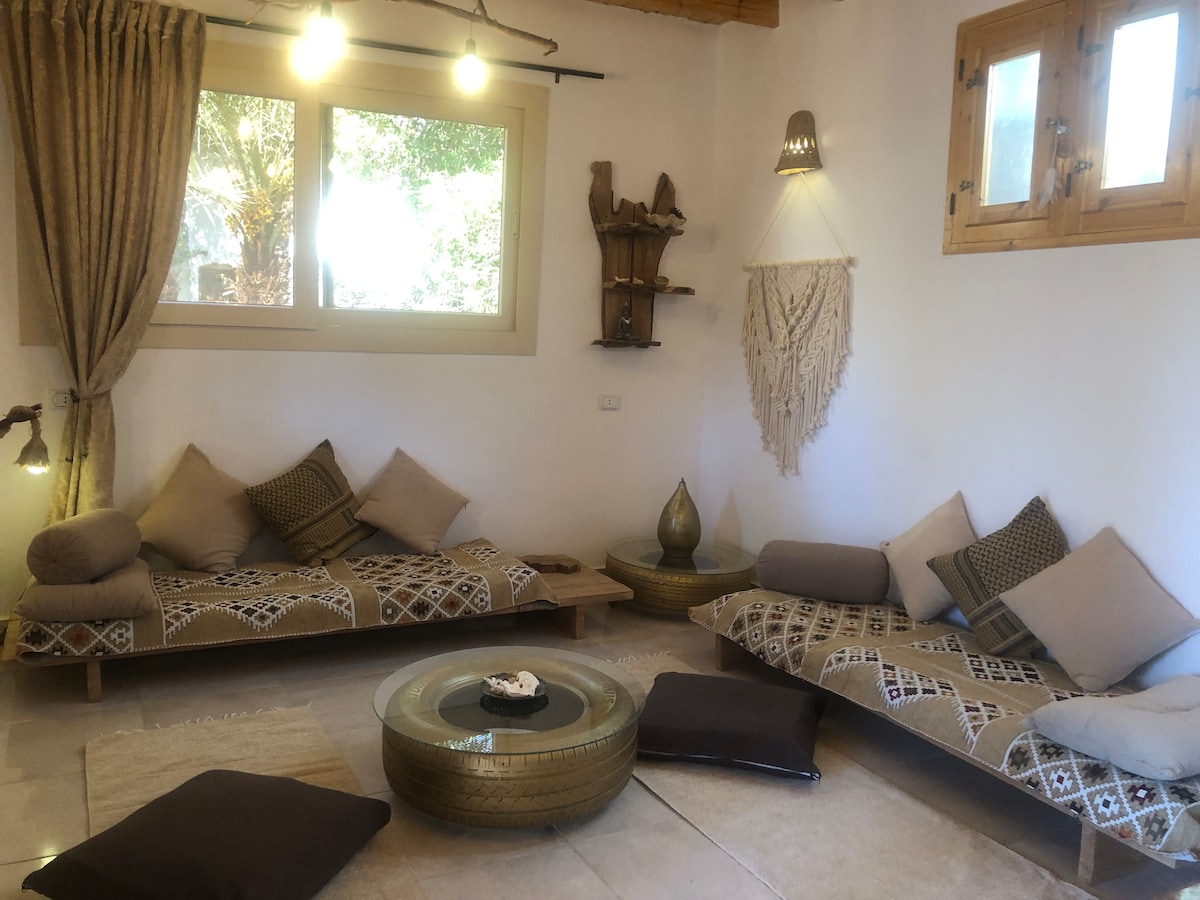 Welcome to your dream escape in Dahab!Nestled amidst a serene farm and surrounded by the majestic Sinai mountains, this two-story earth home is the perfect fusion of nature and luxury. Crafted entirely from clay and wood, our one-of-a-kind eco-home offers you a truly unique experience, where sustainable living meets comfort and style. Whether you're looking to disconnect from the hustle of city life or indulge in a peaceful retreat, this stunning earth home is the ideal destination.