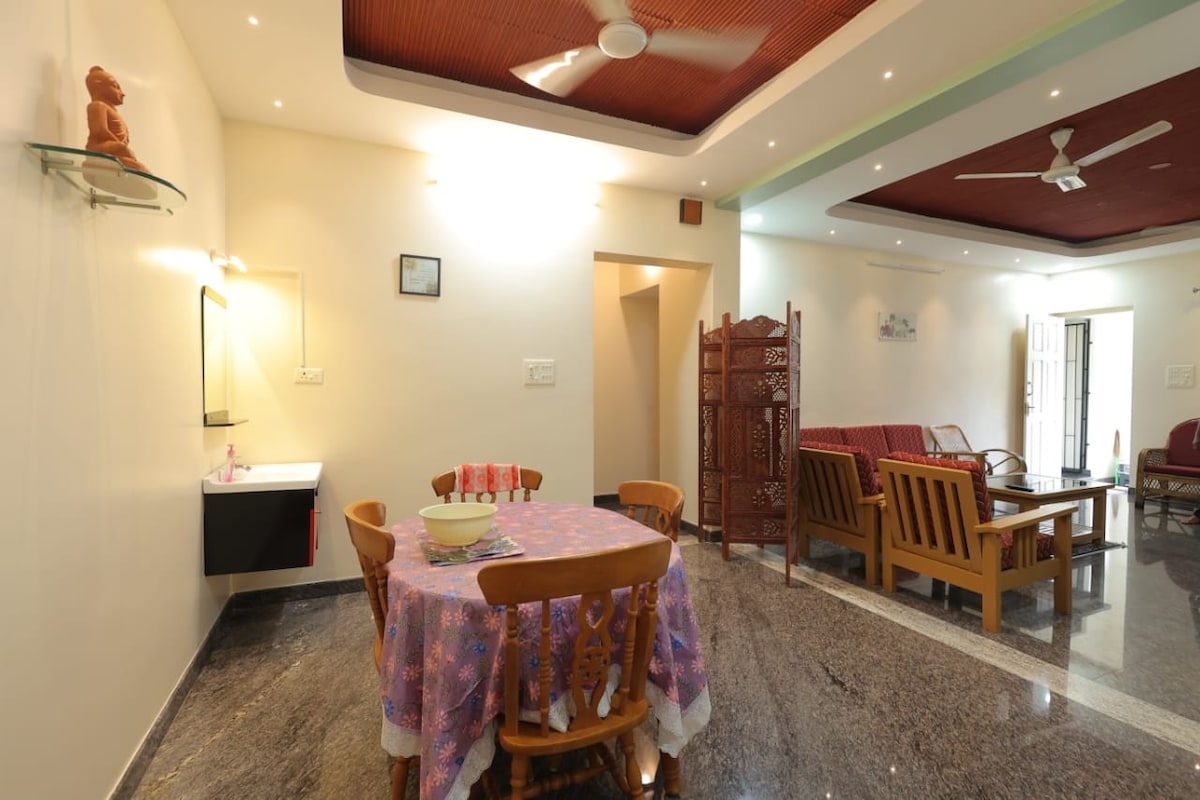 Come spend memorable moments with us at great value! Enjoy a fully private 2BHK on the ground floor, surrounded by gardens, coconut palms, and lush greenery. The peaceful atmosphere and beautiful monsoon views make it a perfect escape for families, couples, or friends. Relax with complete privacy while staying close to Pilikula Nisargadhama, markets, and bus stops. Just 100 m from bus stop, with Mangalore Junction Railway Station (10 km) and Mangalore International Airport (13 km) nearby.