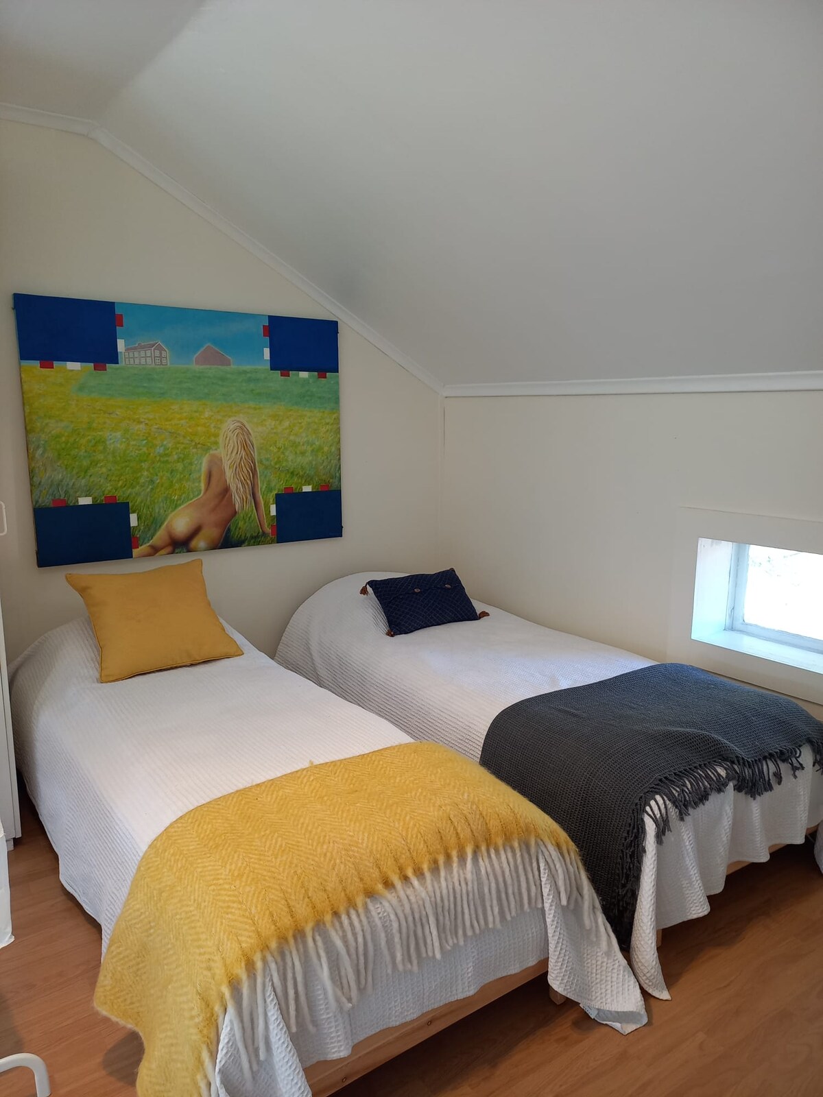 ダーラナの小さな村で、私たちは農場の小さな家を改装しました。自然、釣り、ゴルフに近いです。 2台の90cmのベッドは、必要に応じてダブルベッドに接続できます。また、2階には大きなソファとワークスペースがあります。ベッドに折り畳むことができるアームチェアは、子供や若者に最適です。 1階には新しく改装されたキッチン、ダイニングテーブル、シャワー付きトイレ、2人用のソファベッドがあります。 追加で1名様用のゲストベッドをご用意することも可能です。