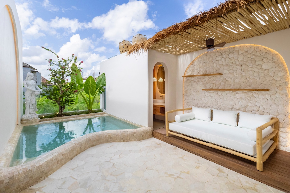 Honeymoon villa with huge pool & coconut garden. Prime location walking distance to all the restaurant & cafes in Canggu. Huge private pool & gets sun all day perfect for tanning on the terrace. Two bedrooms have king beds AC & 55" TVs + bathrooms. Living area with AC full kitchen, lounge dining & Bluetooth speaker. The staff come daily for cleaning & in-house massage table- the perfect way to relax. We are surrounded by Bali's best cafes & restaurants, Epic location at Echo Beach & Batu Bolong.
