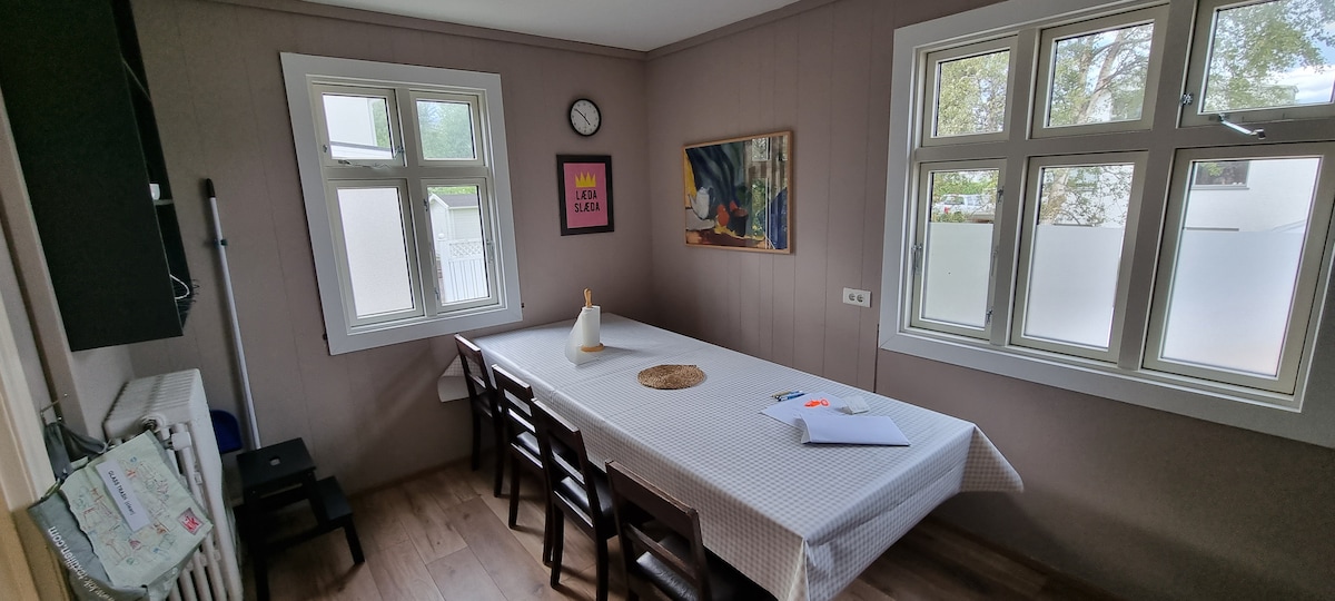 「Smiðjan」鍛冶屋は、元の美しさと快適さを重視して愛情を込めて修復されました。小さな工業地帯の端に位置しており、隣人を気にせず、完全なプライバシーを楽しむことができます。 大きな屋根裏の窓は、オーロラと素晴らしい景色を眺めるのに最適な場所です。Smiðjanは、北部の小さな漁村Dalvíkの海岸にあるほぼ100年の歴史を持つ家で、壮大な山々と谷の景色を眺めることができ、ハイキングはすぐ近くで楽しめます。