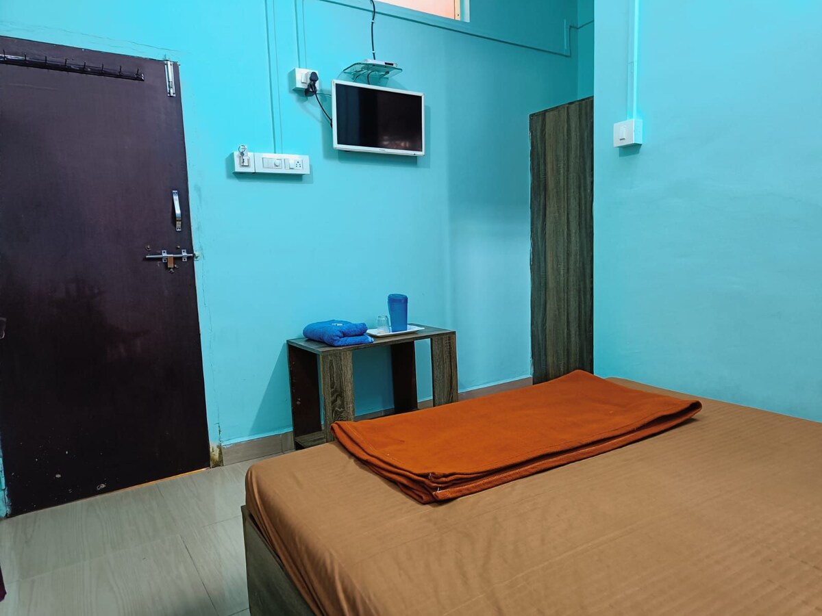 Simple, private, non-AC and comfortable room at Kamat Homes, suitable for up to 3 guests. Ideal for solo travelers, families, students, and backpackers seeking a peaceful, budget stay. The room includes a double bed with clean mattress, fresh bedsheet, pillows and blanket, good ventilation, window, side table, chair, and charging point. Private attached wash area with washbasin and bathing space. Quiet, clean, and homely atmosphere.