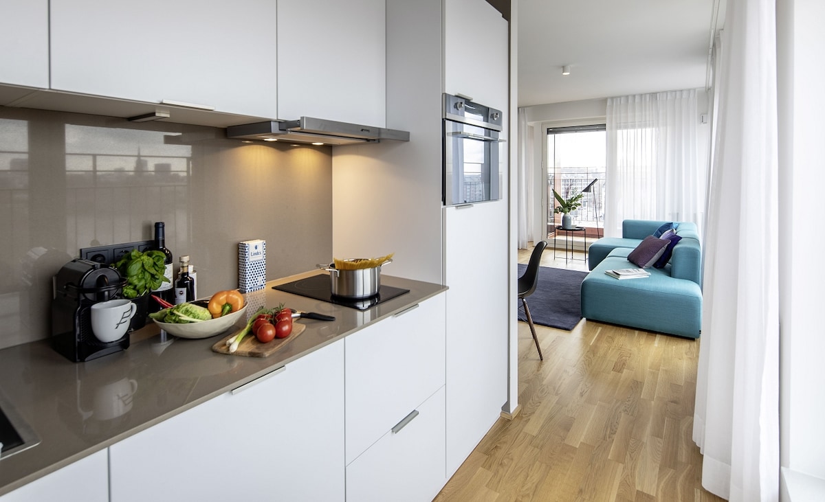 Brand New Modern flat with incredible city and sunset view over Frankfurt. Very large living room creating a wide open space. New designer kitchen with marble stone island. Modern and Mid-Century Furnished. The 102 sqm flat is at the 17th floor of the tower with a great view over Frankfurt. You can enjoy a furnished terrace with panoramic view where to experience full sunset lights creating a very cozy atmosphere with evening light. Exclusive walk in closet perfect for long stays. Garage parking