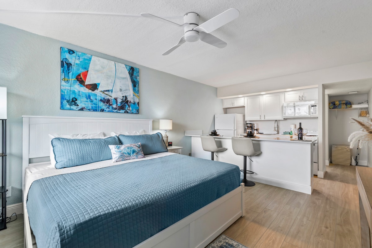 快適さとシンプルさを追求して設計されたこのオーシャンフロントのキングスタジオは、リゾート料金を支払うことなくビーチフロントにアクセスしたいカップルや一人旅の方に最適です。 室内には、豪華なキングサイズベッド、2人用の居心地の良いダイニングスペース、フルサイズの家電を備えたフルキッチンがあり、自宅のように料理をしたり、リラックスしたり、くつろいだりできます。 外に出ると、朝の散歩や夕日を眺めることができ、海の空気を吸いながらビーチに出かけることができます。