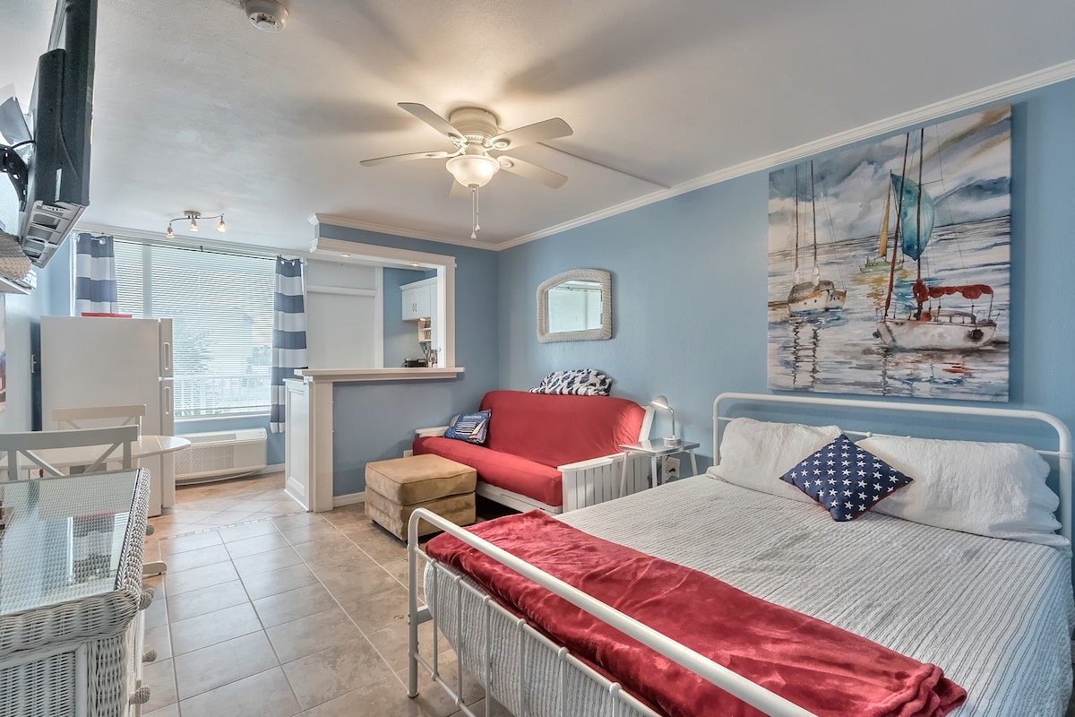 ***新しいプールとビーチへのアクセスがオープンしました!*** デイトナビーチブリスへようこそ!ビーチからすぐ近くの新しく改装されたオーシャンフロントのスタジオをお楽しみください。5階のプライベートバルコニーからは美しいオーシャンビューが一望できます!朝日の出を眺めると、イルカが見えるかもしれません! デイトナビーチクラブにあるこの快適なスタジオは、キングサイズのベッド1台と引き出し式ソファ1台があり、4人まで宿泊できます。このスペースは、大人2名様または大人2名様とお子様1〜2名様のご家族に最適です。