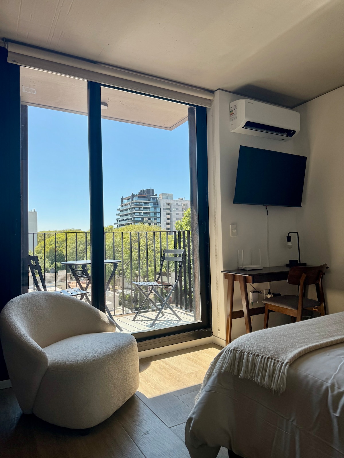 モンテビードの最高の場所に位置するワンルーム(スタジオ)で、歴史的建造物「ランブラ」の中にあり、ポシトスビーチとゴメンソロ広場の素晴らしい眺めが楽しめます。 ショッピングセンター、レストラン、スーパーマーケット、薬局に近く、市内の移動に便利な場所に位置しています。 便利です。 最大3名様まで宿泊可能な設備がすべて揃っています。 24時間体制のドアマンとビデオ監視 アプリでビル内のランドリーサービスが利用可能です。