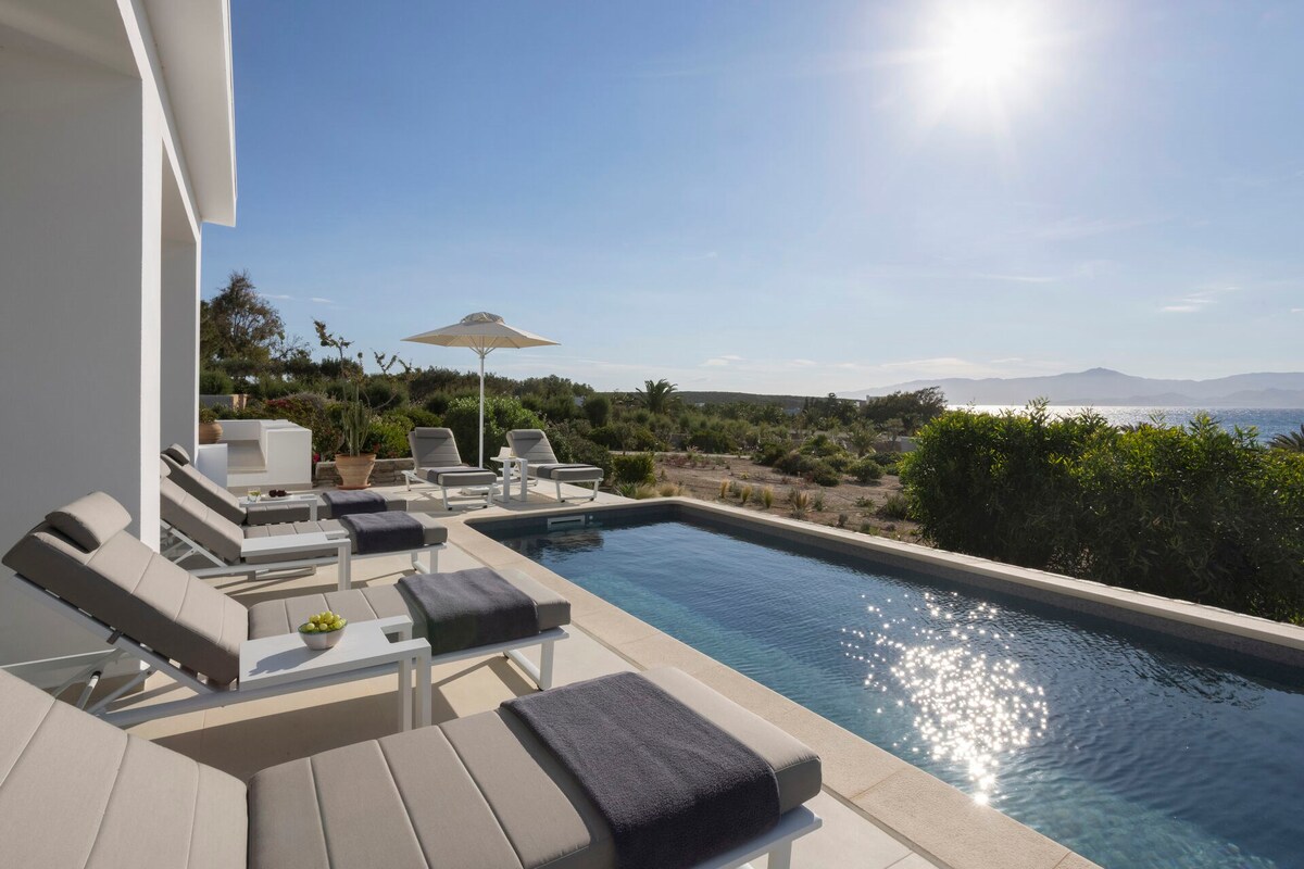 This home is sleek and beautiful with a minimalistic, coastal theme throughout, settled just off the Paros coast and offering expansive, breathtaking views. Large windows bring the sunshine right into your lap, whether you're whipping up a feast in the fully-equipped kitchen or waking up in one of the plush beds and stepping straight out to greet the day.