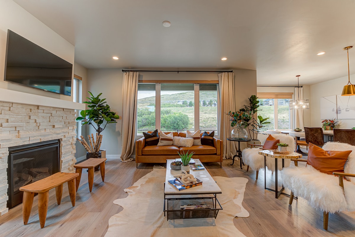 This stylish condo has stunning views of Deer Valley and Park City ski resorts minutes away, overlooking the Jordanelle Reservoir and Upper Provo River, in a new luxury home community called Benloch Ranch. Sit in the private 7 person hot tub or outdoor Finnish sauna, taking in the magnificent views, even do yoga outside on the deck, or relax after a day of skiing, hiking, biking, fly fishing, paddleboarding on neighborhood ponds or nearby lake, or other Park City area activities.