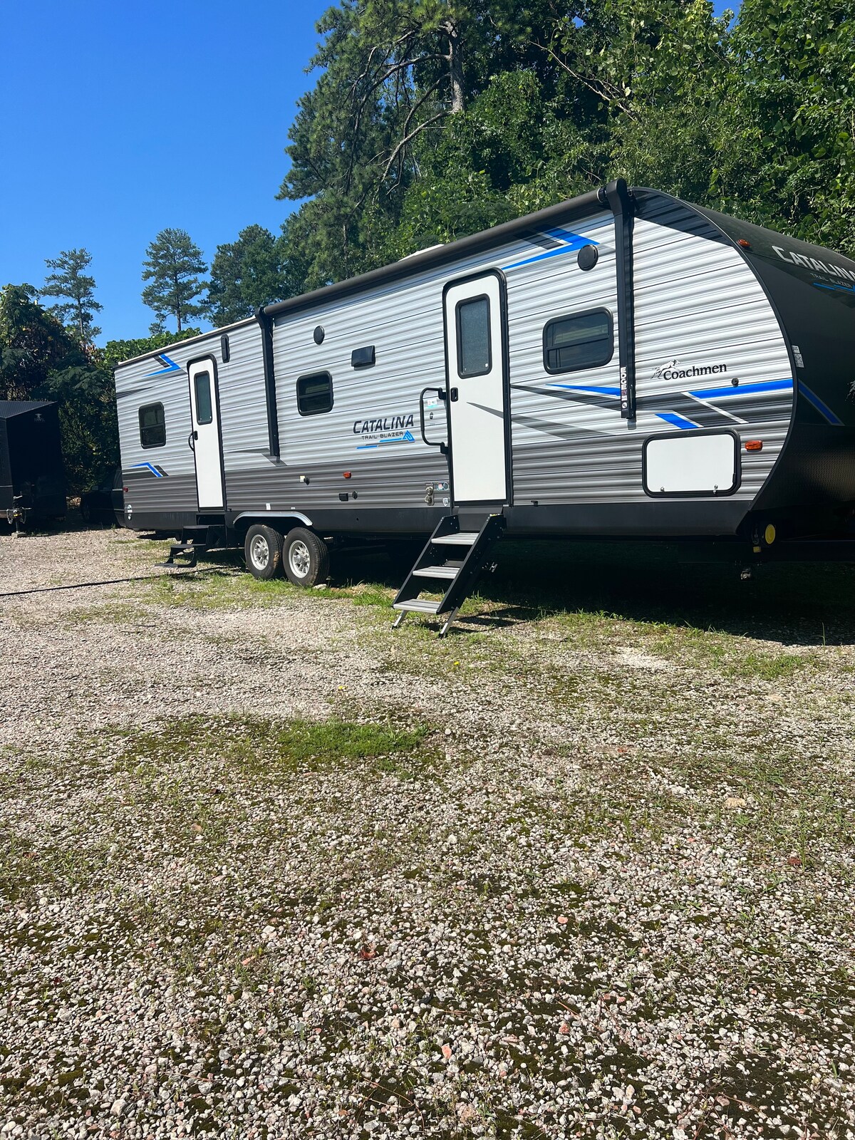 自宅のような素晴らしいお家です。外の静けさを楽しみ、快適に眠ることができます。中にはスマートテレビが2台あります。RVにはWi-Fiがあります。屋内で調理するか、屋外でポータブル炭火グリルでグリルしてください。石炭とライターオイルをご用意しています。Bluetoothラジオ。RVにはお皿、コーヒーメーカー、ボウル、カップ、調理器具が備わっています。椅子は外側の収納コンパートメントにあり、新しい20フィートのオーニングの下で屋外での座り心地をお楽しみいただけます。屋内と屋外のシャワー。RVには2ガロンのガスが搭載されています。