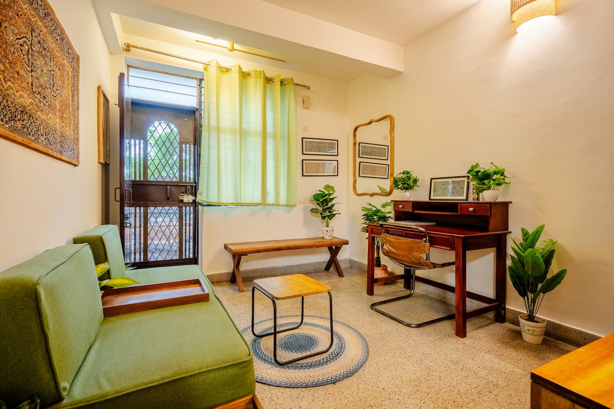 中心部に位置するバーサティ(家の上の雨の部屋)は、スタイリッシュで広々としています。 このシックなお部屋は、150年以上前に建てられたハヴェリの2階にあり、グリーンパーク地下鉄駅から100メートルのところにあります。 その通りです! わずか100メートル。南デリーの中心部にあり、リラックスして元気を取り戻し、インスピレーションを感じることができる静かで趣のあるオープンスペースを提供しています。 パノラマバルコニーからは、古き良き時代を思い出すことができます。 免責事項:隠れた名所です!!