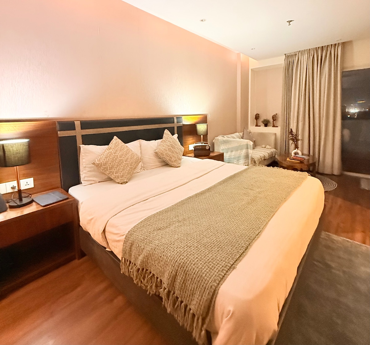 グルガオンのセクター43にあるプレミアム1BHKサービスアパートメント。リビングルームとベッドルームにエアコン、簡易キッチンにはIH、電子レンジ、カトラリーが備わっています。ゴールドスークモールとシャロムヒルズスクールまで徒歩圏内の高級エリアにあり、ミレニアムシティセンターメトロから2.2 km、フォーティス病院から2.1 kmです。外国人ゲストも大歓迎です。アーリーチェックインは空室状況により、500ルピーの料金がかかります。また、レイトチェックアウトも同様に、3時間ごとに500ルピーが追加されます。
