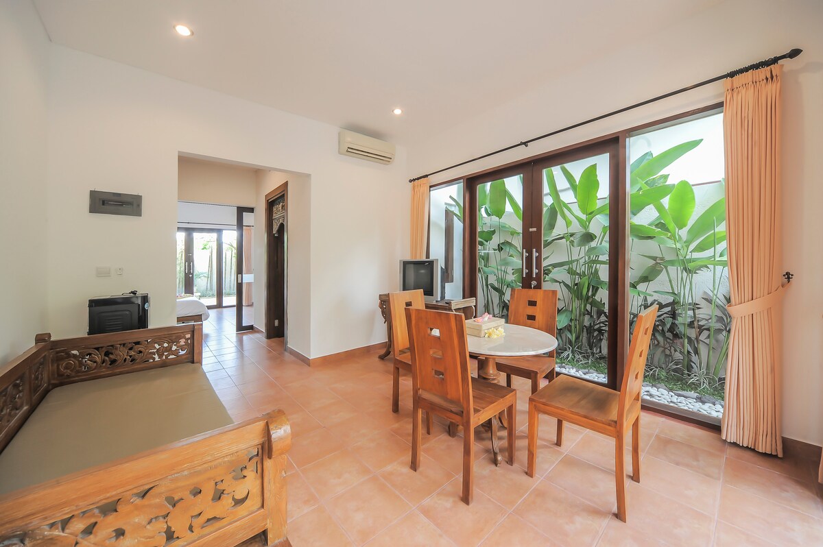 中心部に位置する落ち着いた宿泊先に滞在して、家族や友人、会社のグループ旅行をシンプルに楽しみましょう。サンセットロードクタの近くにあり、バイクや車の駐車場があります。Wi-Fi、エアコン、テレビ、ホットシャワー、プール、キッチン、リビングルーム、ダイニングテーブルをご利用いただけます。ゲストは日次、週次、または月次レンタルで予約できます。チェックイン時に身分証明書(パスポート/KTP)をスタッフに提示するだけです。スタッフは全員ワクチン接種を完了しています。プールはプライベートではなく、宿泊施設の隣にあります。