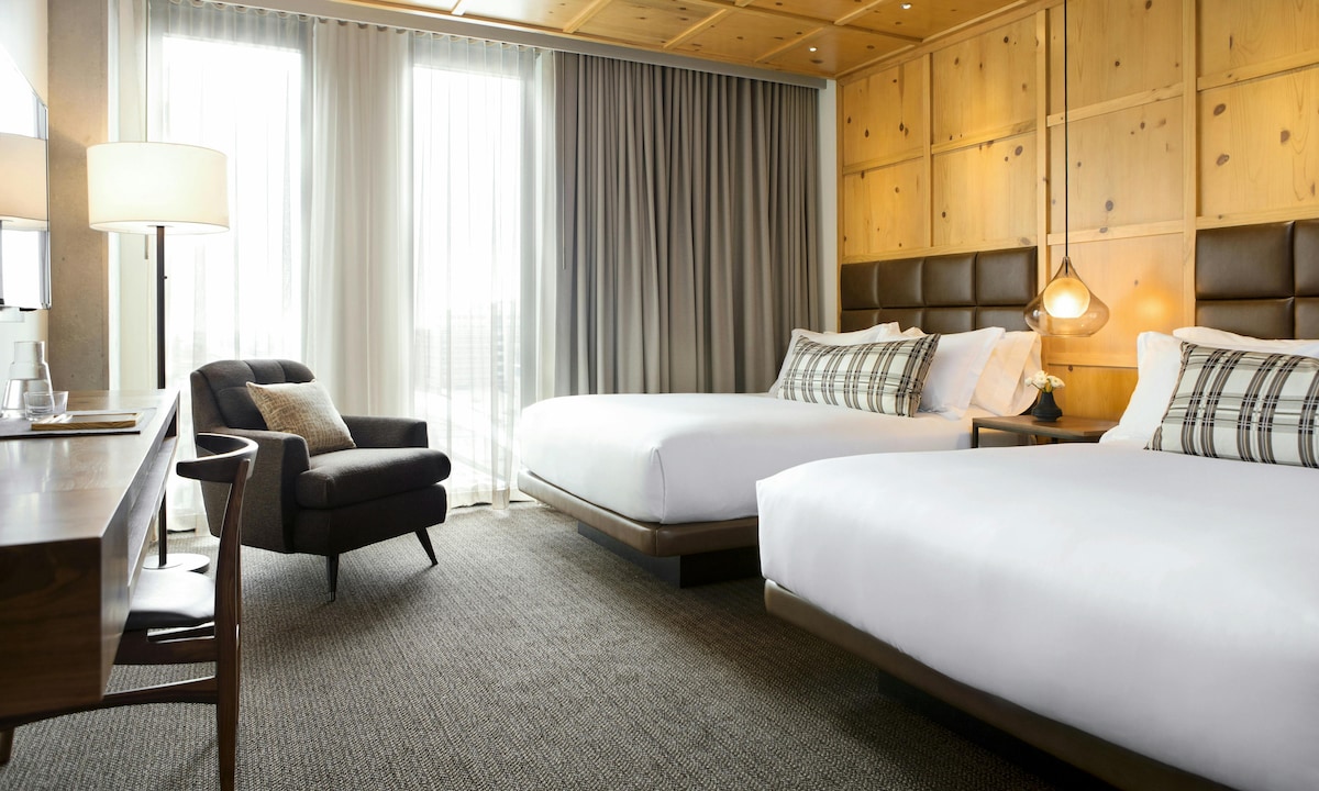 Chic hotel room with two queen beds