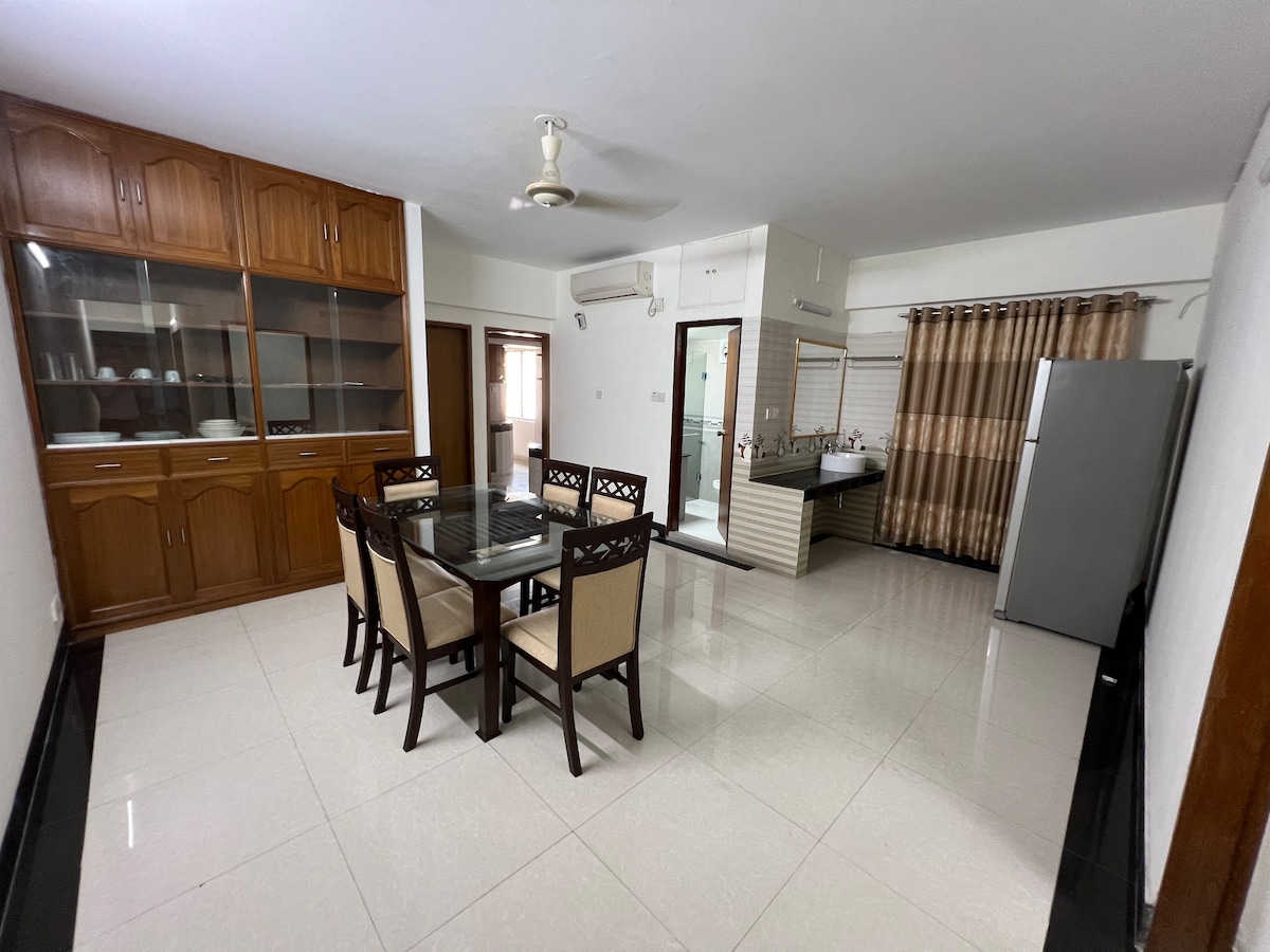 家族連れや海外からの訪問者向け。バシュンドラの非共有フラット。空港から5 km、エバーケア病院から½ km。 ICCBコンベンション、ジャムナモール、バリダラ、グルシャンのすべての大使館の近く。 24時間警備員と防犯カメラ。エアコン、Wi-Fi、テレビ、電子レンジ、冷蔵庫、洗濯機、調理器具が備わっています。 近くにはレストラン、食品、食料品、ランドリーデリバリーショッピングモールがあります。 アパートは7階建ての建物の6階にあります。 未婚のゲストの予約は受け付けていません 月額割引を受け付けています