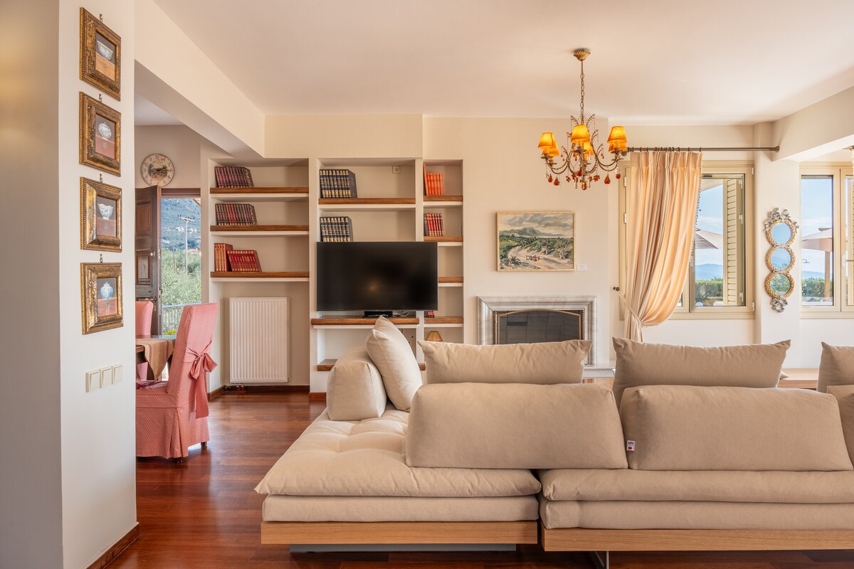 「素晴らしい眺め」 タイゲトス山の麓、標高650メートルに位置するのは、伝統的な村ツェリアです。 車で直接アクセスできる村の入り口にある、完全に改装された家が、バルコニーからメシニア湾の素晴らしい景色、壮大な夕日を楽しむためにあなたを待っています。都会のリズムを忘れ、静けさと気候の良いエリアをお楽しみください。
