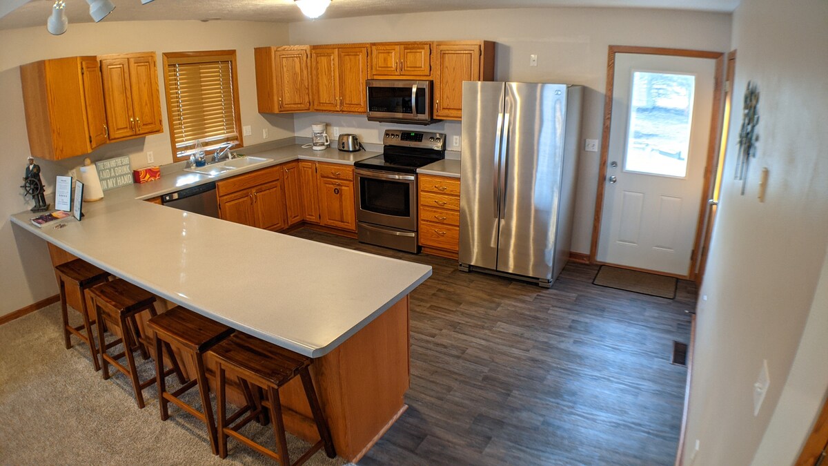 シルバーレイクの美しい湖畔の家。 アイオワ州レイクパークに位置し、東に湖の景色、西にゴルフ場があります。 ボート、スキー、ジェットスキー、釣り、ゴルフが楽しめる静かでファミリー向けのエリアです。 1階にはキングベッド、バスルーム、キッチン、ファミリールーム、リビングルーム、ランドリー、ガス暖炉を備えた寝室が2部屋あります。 最上階にはクイーンベッド1台、シングルベッド1台、大きなバスルーム1室を備えた寝室が2部屋あります。 屋内にはガス暖炉、焚き火台、ガスグリル、デッキがあります。