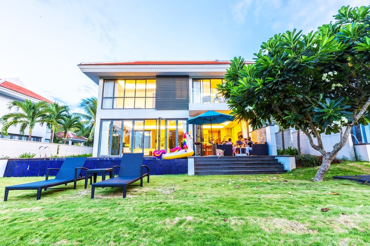 ヴィラはオーシャンヴィラにあり、ヴィラを見下ろす屋外プール、庭園の景色、涼しい緑で覆われたヴィラを囲んでいます プールエリアには、屋外のテーブルと椅子、大きなパラソル、2つのサンラウンジャーがあります 広々とした裏庭で、家族や友人と屋外バーベキューパーティーを楽しむことができます 車やバイクを収容できるスペースがある前庭 オーシャンキャンパスで散歩をしたり、レストランまで徒歩約3分、ビーチまで徒歩約5分