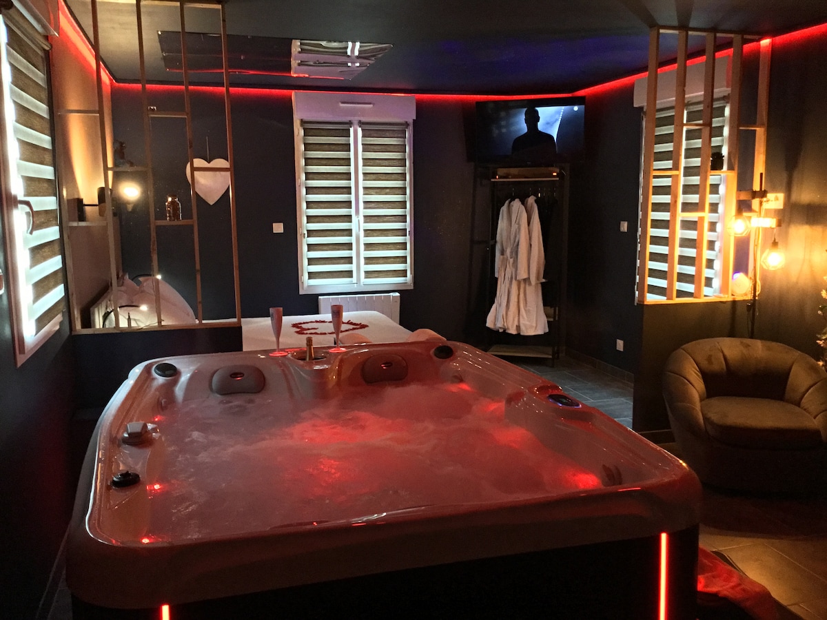 Nous vous proposons une expérience unique dans une maison de 60m2 avec de nombreux équipements bien-être (sauna INFRAROUGE, baignoire balnéothérapie, siège massant 360° ) à l'étage vous disposez d'une chambre avec un grand lit King size 180x200 et le petit plus dans cette escapade romantique sera sa pièce secrète complètement envoûtante(fauteuil tantra, miroir, croix de st André) Vous aurez accès à une cuisine entièrement équipée (four, micro-onde, dolce gusto, bouilloire) Petit- déjeuner inclus