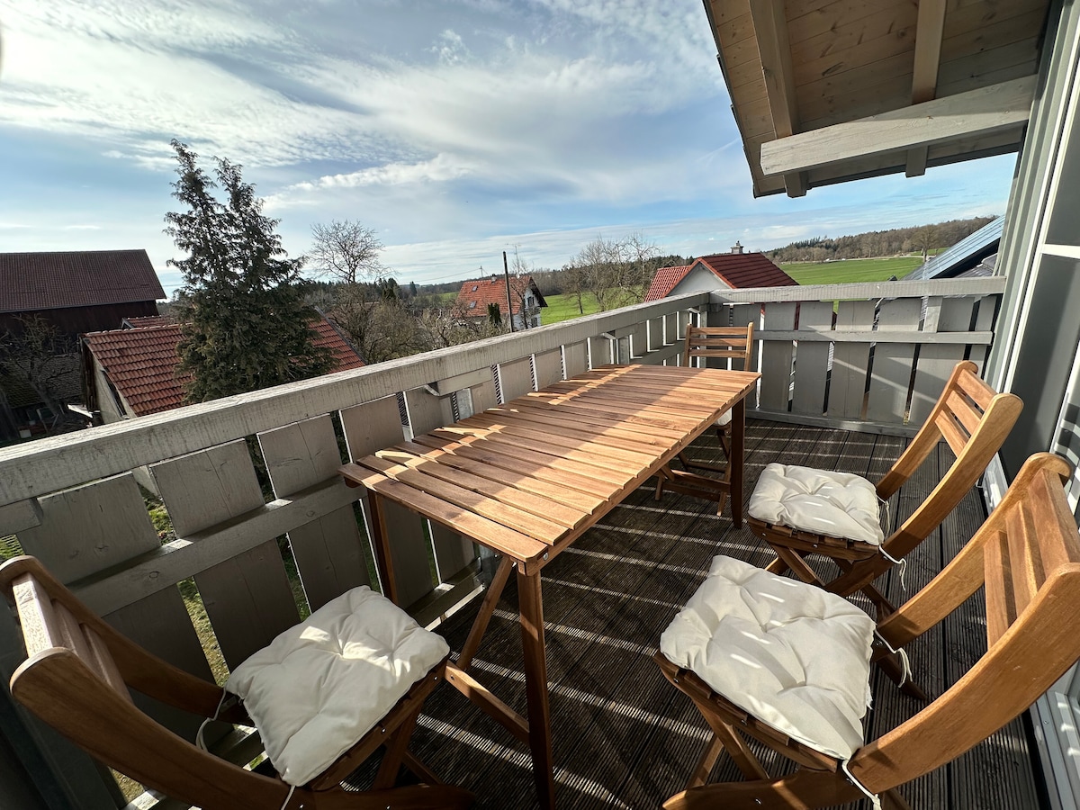 2階のアパートは、Dießenの郊外にあり、礼拝堂と村の池を備えたWengener Dorfplatzにあります。 閉鎖されたアパートメントは、別の外部階段を介してアクセスでき、80平方メートルの広さがあり、最大4名様までご宿泊いただける素晴らしいホリデー宿泊施設です。