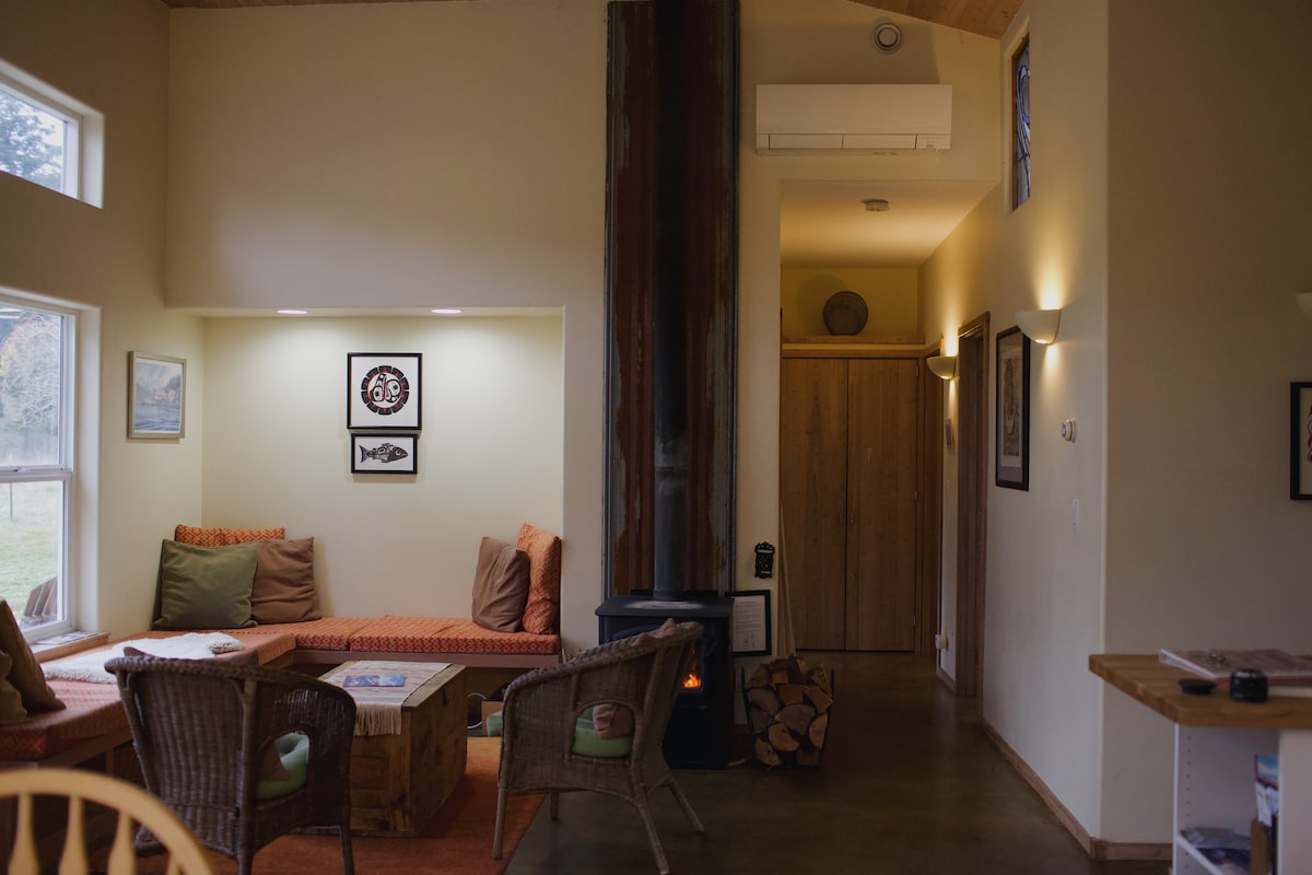 ガス式暖炉付きの明るい森林キャビン、6名様が宿泊可能。