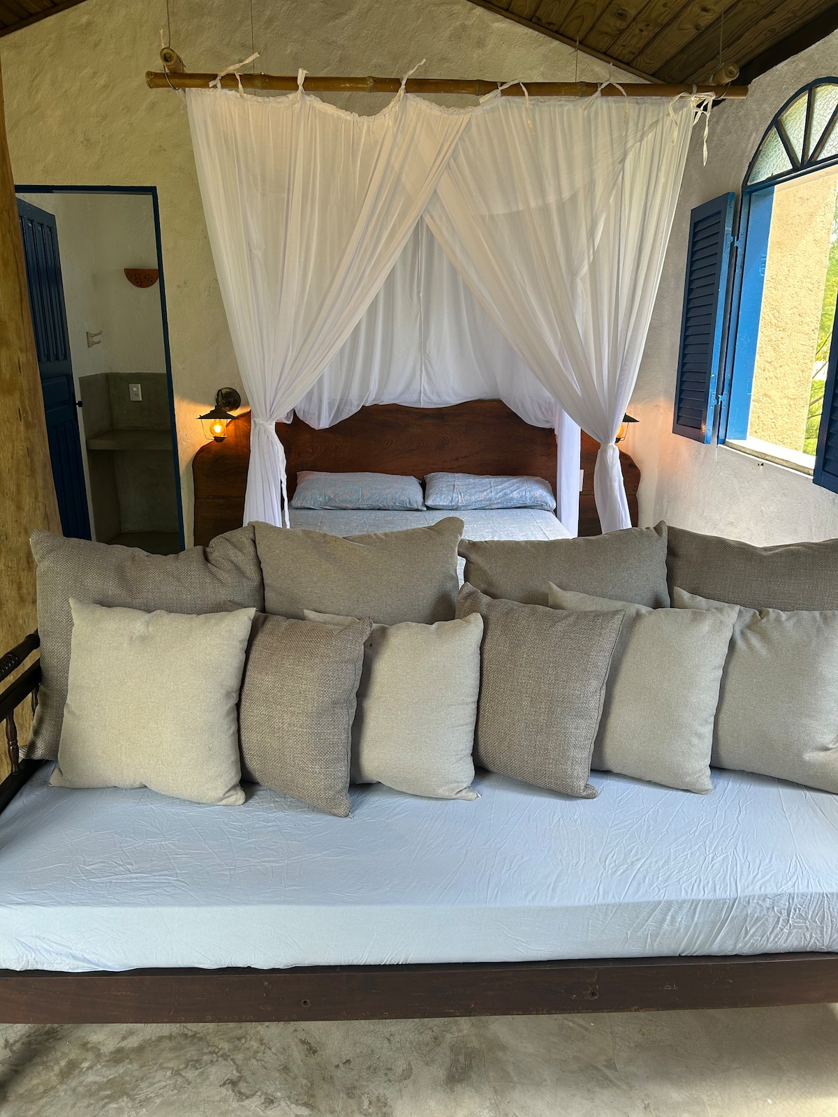 Disconnect from routine and reconnect with nature in this charming rustic glamping-style cabin, located inside Camping Macacos D'Ajuda. An ideal retreat for those seeking peace, comfort, and a touch of adventure. The cabin features a super-comfortable queen bed, a fan, 220v outlets, and a refreshing outdoor shower — perfect to start the day surrounded by greenery. The bathrooms are shared, with separate facilities for men and women, always clean and well maintained.