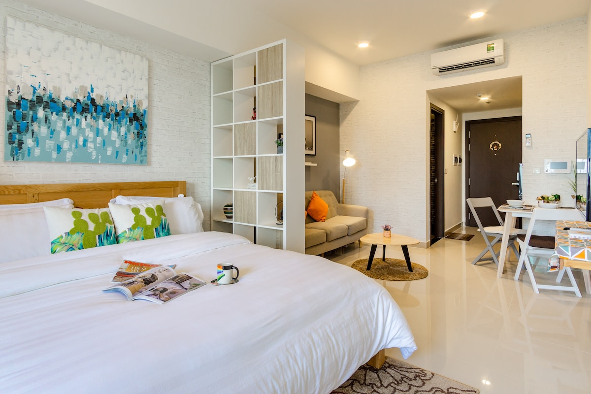 このユニークな場所は、豪華なスタイルの体験のために設計されています。スマートなスライドドアを使用すると、リビングとベッドルームが簡単に接続され、広々とした50平方メートルの家を最大限に活用できます。 コンドミニアムとD1の間にあるBaSon橋を歩くと、サイゴン川の風と街の素晴らしい景色を感じることができます。 タクシーでわずか5 ~10分で、市内中心部に行くことができます。